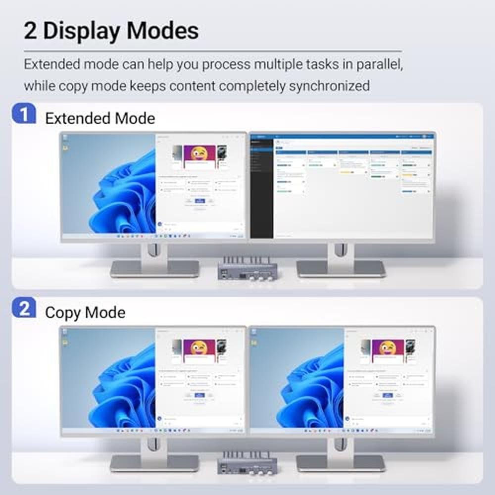 - Dual Monitor HDMI KVM Switch: This 2 Port HDMI KVM switch allows user to connect and control two computers with one set of keyboard, mouse and two HDMI displays, ideal for multitasking and productivity. Our KVM switch supports copy mode and extended mode to meet different application scenarios. Please ensure that both computers support multi-screen display, and both have at least 2 HDMI ports.