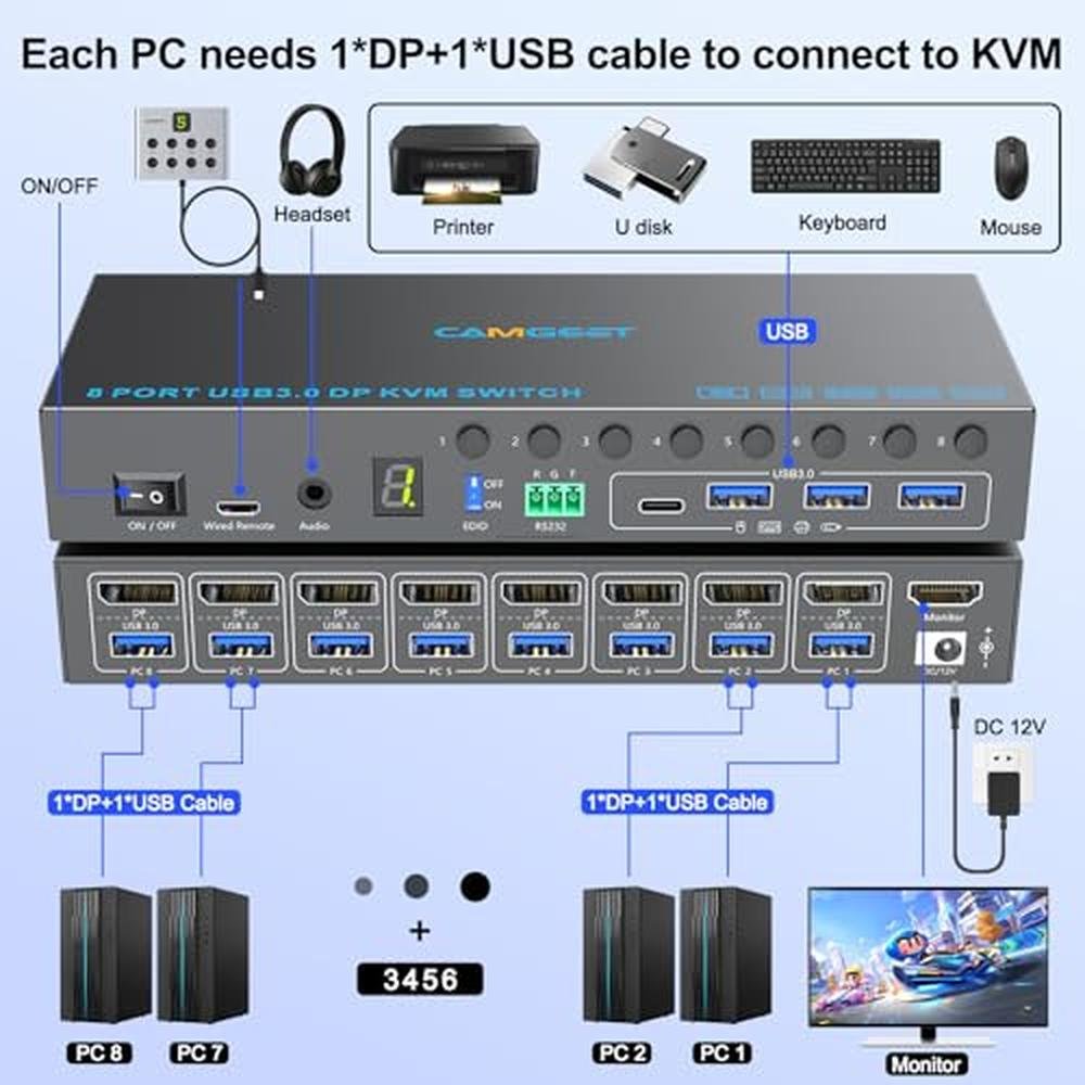 - 8 Ports DP KVM SwitchThis 8 port KVM switch can control up to 8 computers to share 1 monitor and 4 USB 3.0 devices. You can easily switch between 8 computers. 1 set of keyboard and mouse controls 8 computers, plug and play, no need for drivers, and no need to unplug and plug cables back and forth