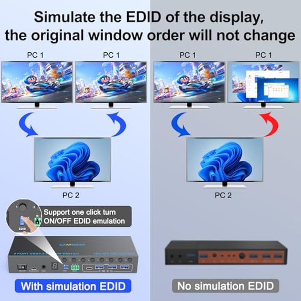 - DP KVM Switch with EDID simulationCamgeet 8 computers KVM switch can simulate the EDID of the display, when the monitor is switched between 8 computers, the original window position will not be changed.You can turn on/off the EDID emulation function as needed