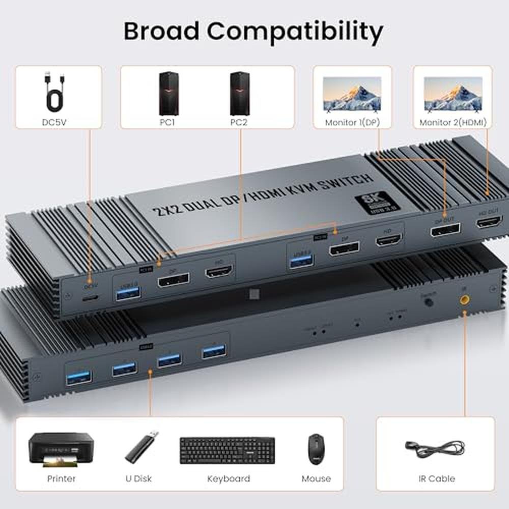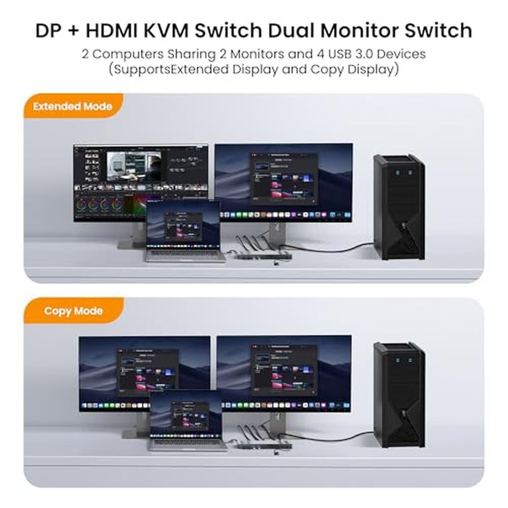 - HDMI Displayport KVM Switch Dual Monitor: 8K@60Hz KVM Switch 2 monitors for 2 computers with DP 1.4 and HDMI 2.1 port devices with 4 USB 3.0 ports to share USB devices such as keyboard, mouse printer, USB flash drive, etc. The 2x2 DP HDMI KVM switcher supports extended and Copy modes. Note: Please make sure your computer/laptop has DP port and HDMI port and KVM does not support signal conversion function (HDMI input can only output to monitor with HDMI, DP input can only output to monitor with DP).