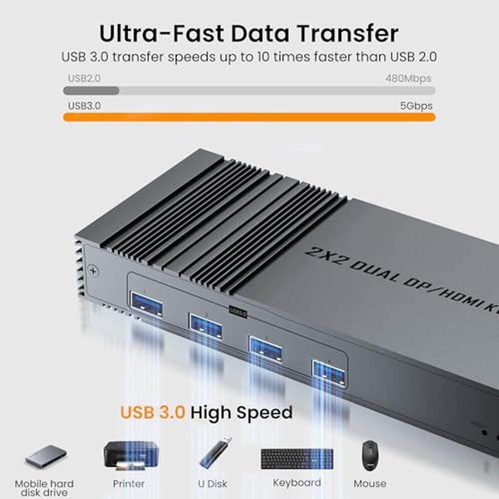 - Ultra-High-Speed Transmission: This 4K@144Hz dual monitor kvm switch has 4 USB 3.0 ports for sharing mice, keyboards, USB printers, scanners and more. Data transfer rates of up to 5Gbp/s are more than 10 times faster than USB 2.0 ports and are backward compatible with devices such as USB 2.0 and USB 1.1. The kvm switch 2 monitors 2 computers displayport comes with a 5V1A power adapter that provides increased drive power and ensures a stable operating environment for each device.