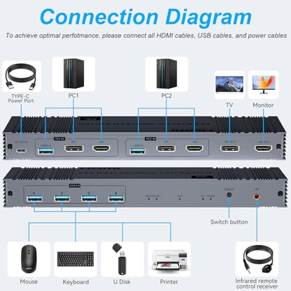 - 8K Ultra HD Resolution: This HDMI+DP kvm switch support for resolutions up to 8K (7680 x 4320)@ 60Hz and is backward compatible.Note: make sure your computers, monitors, and cables all support 8K and high refresh rates.(DP&HDMI cable is not included in the package, please buy it by yourself.)