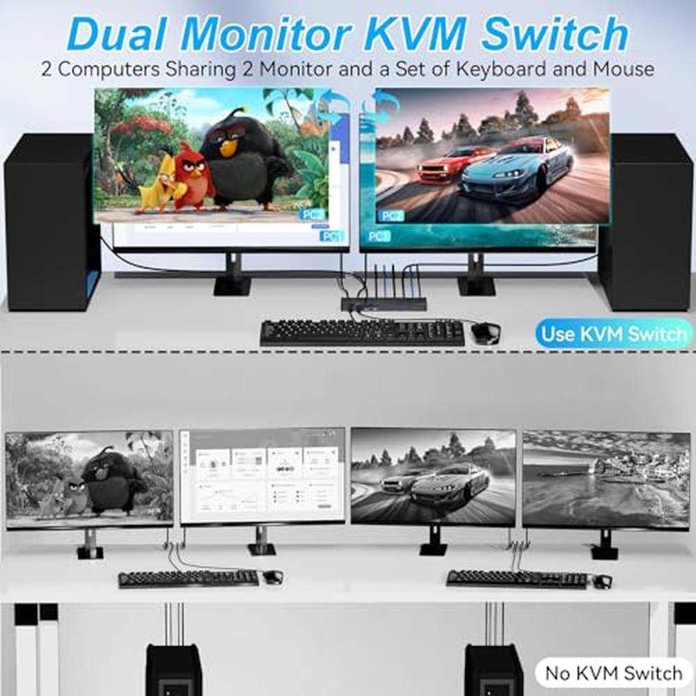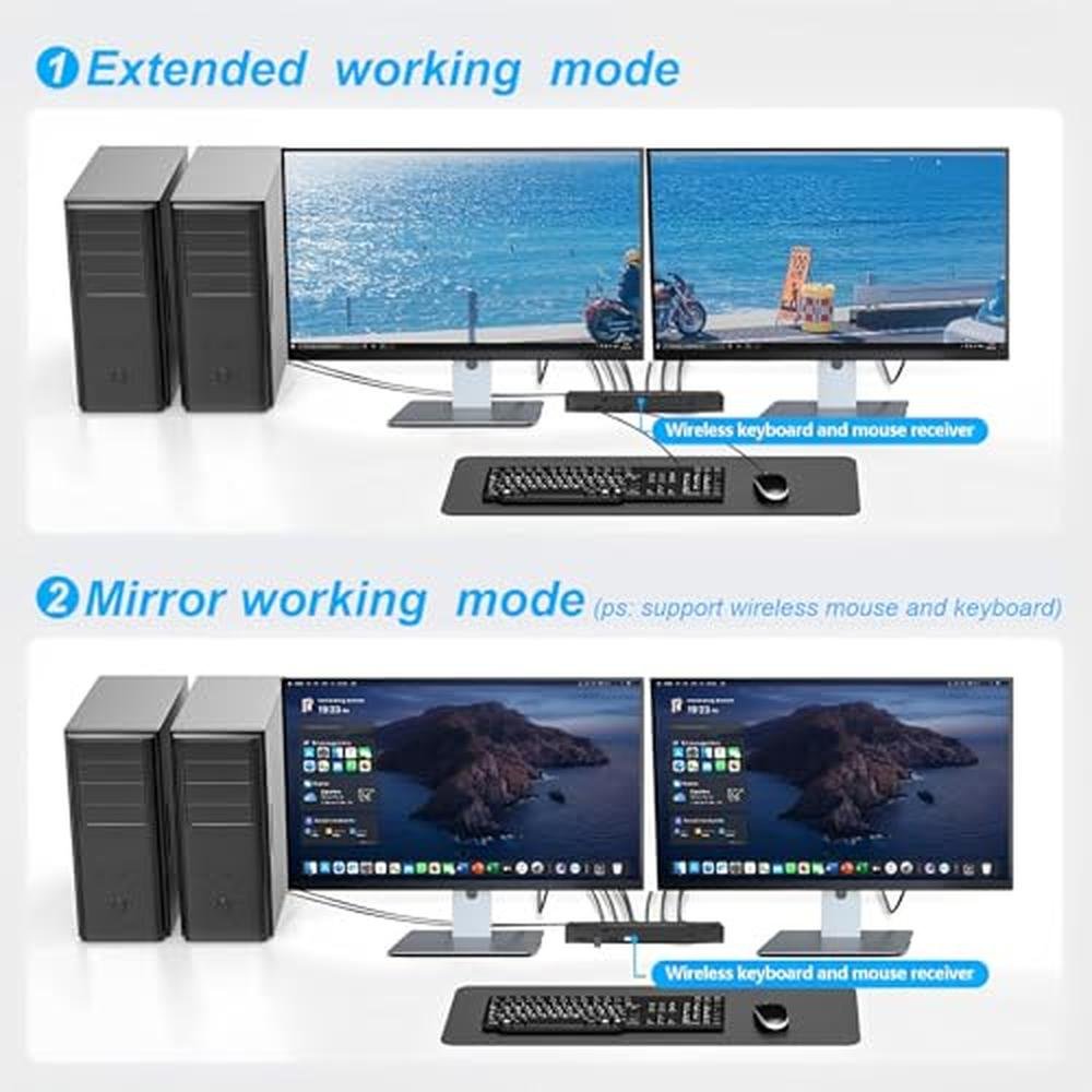 This HDMI KVM switcher allows users to control 2 monitors 2 computers with a single keyboard, mouse.Perfect for users who need expansive screen real estate to enhance productivity and workflow efficiency (Note:Requires 1 HDMI and 1 DP ports for each connected computer and make sure your PC or laptop supports multiple monitors)