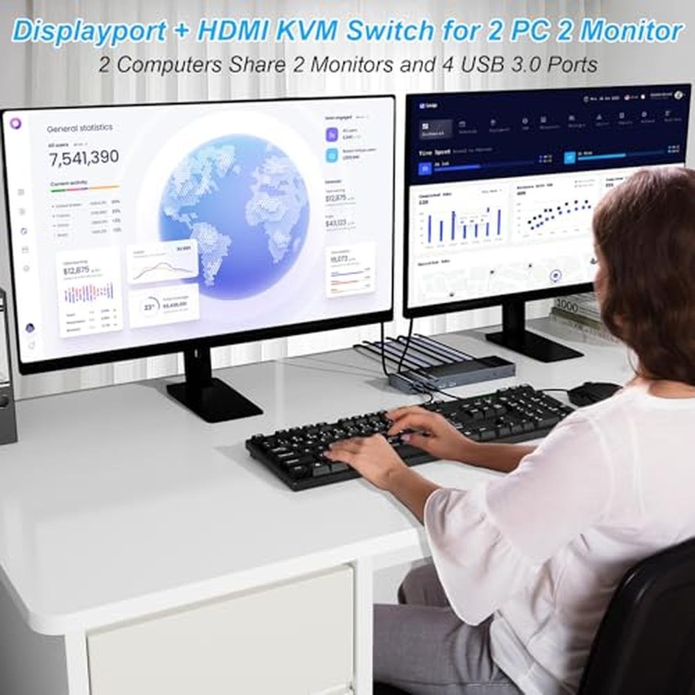 8K HDMI and Displayport KVM Switch 2 Monitors 2 Computers USB 3.0 Dual Monitor HDMI+DP KVM Switch for 2 Computers Share 2 Monitors and 4 USB 3.0 for Keyboard Mouse with IR Controller