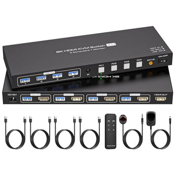 • Stable Transmission & Two switching modesThe kvm switch hdmi includes a 12V1A external power adapter for stable recognition of high-power USB devices with the KVM. You can switch between 4 computers using the infrared remote control or panel buttons, with LED lights indicating the active computer. Simple and convenient. (Please note: This device does not support hotkey switching)