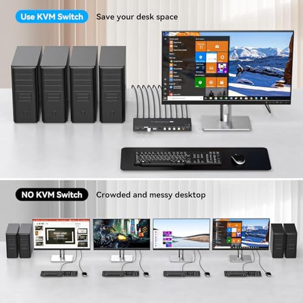 • kvm switch 4 computersThe hdmi kvm switch 4 port allows 4 computers or laptops to share 1 monitor and 4 USB 3.0 devices. You can control all 4 computers directly with a single set of mouse and keyboard. Switching between the 4 computers is easy using the panel buttons or an external remote. It's plug-and-play, streamlining your workspace and boosting office efficiency.(Please note: This device requires that each of your computers and monitors contain at least one HDMI port.)