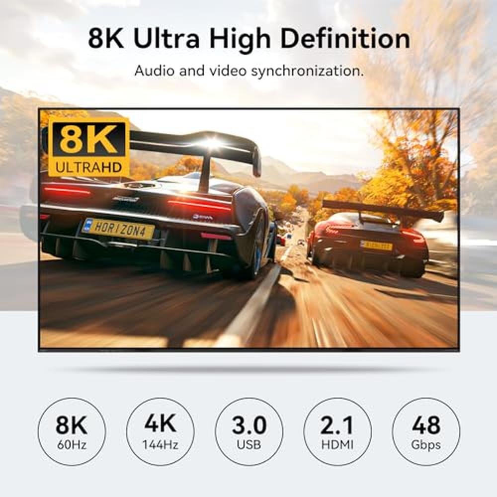 • Ultra HD 8K@60HzThe hdmi 2.1 kvm is equipped with a standard HDMI2.1 port, supporting resolutions up to 8K@60Hz and 4K@120Hz, with backward compatibility. It delivers exquisite, lifelike video effects on the screen. Please note: To achieve these resolutions, both your computer's graphics card and monitor must support 8K@60Hz or 4K@120Hz. Using a high-quality HDMI2.1 cable is recommended for smooth