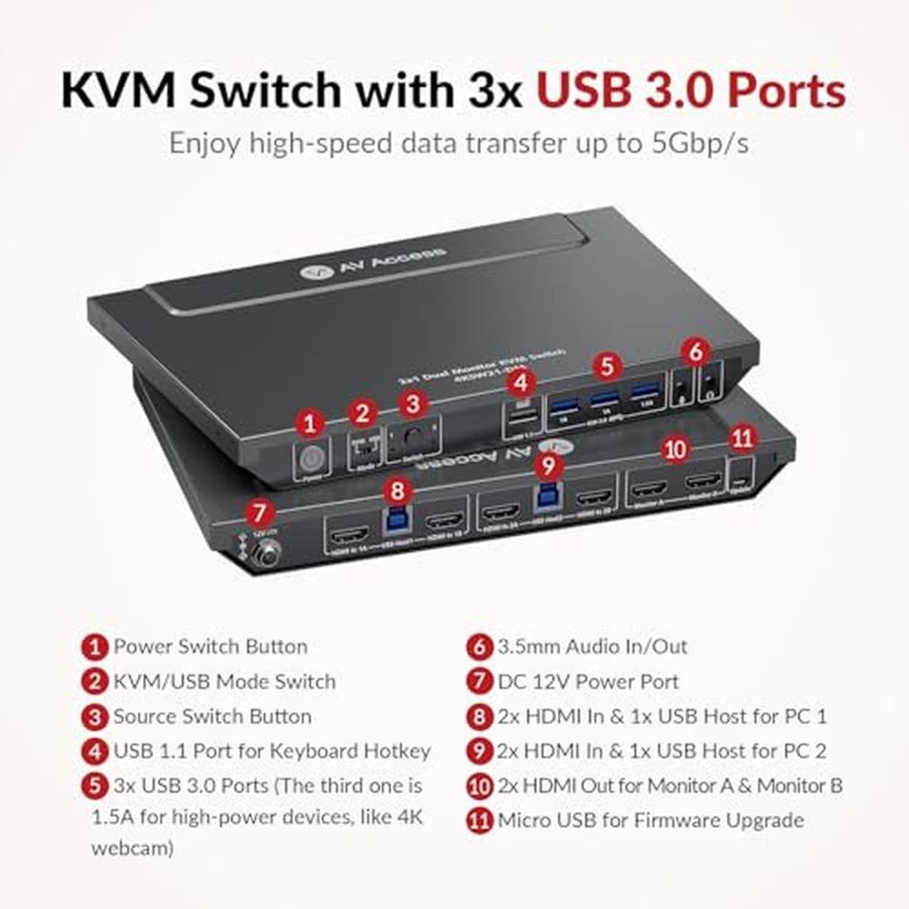 AV Access KVM Switch 2 Monitors 2 Computers, 4 USB, EDID, Fast Hotkey Switch, 4K@60Hz HDMI Dual Monitor Display 1 or 2 PCs Simultaneously,2 Desktops for Dell Lenovo HP Share One Set of Keyboard Mouse