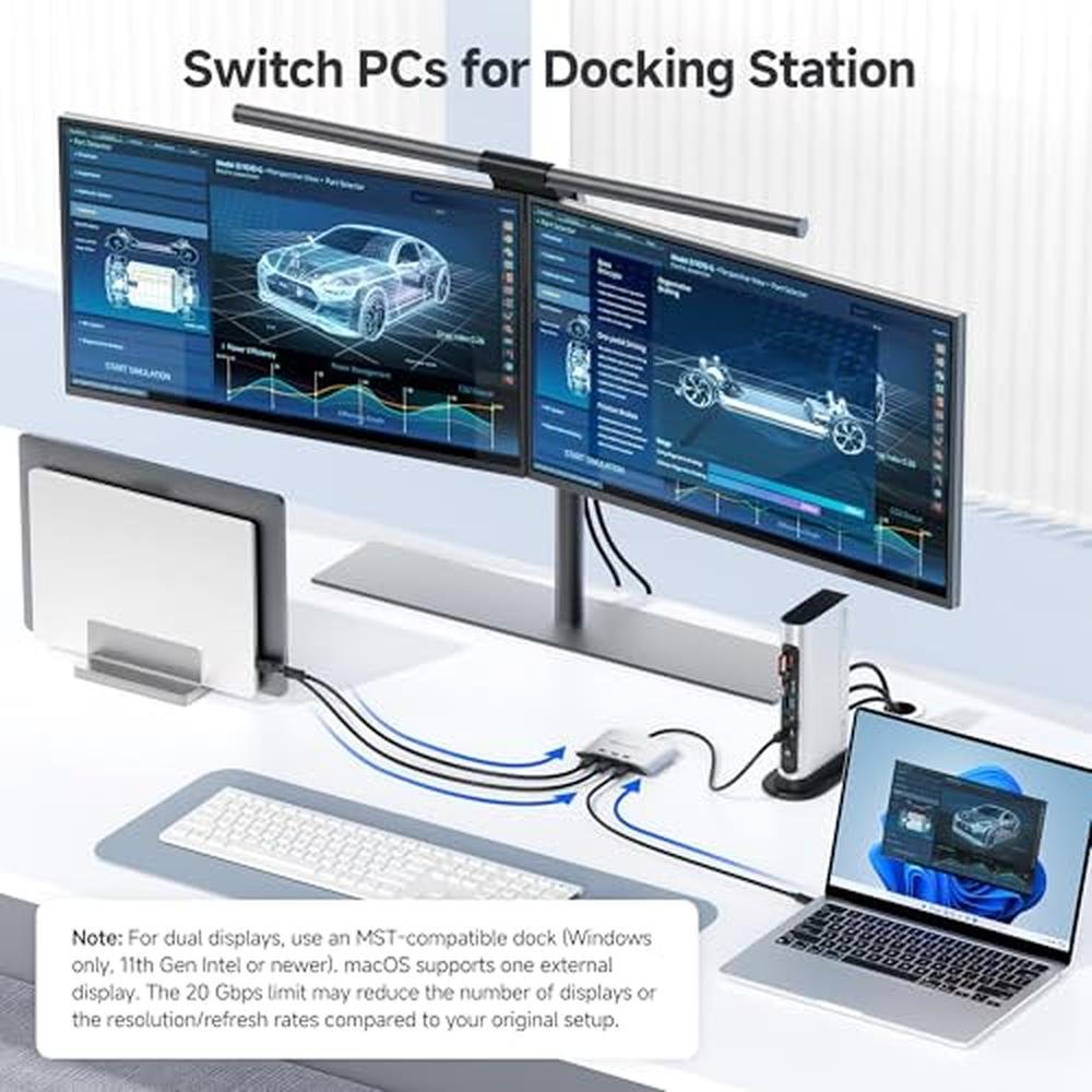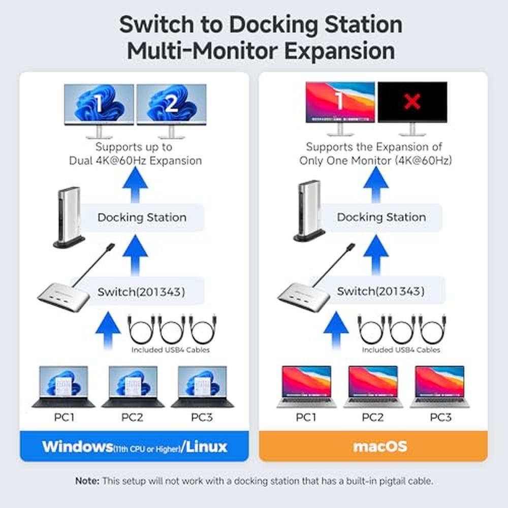 - Compatibility Warning: Use only the included USB4 20 Gbps cables. Do not substitute with Thunderbolt 3/4/5 cables. The switch works with USB4 and Thunderbolt 4 docks, but its 20 Gbps bandwidth (vs. 40 Gbps for most docks) may limit the number of displays or the maximum resolution/refresh rate compared to your original setup. Avoid USB-C docks with built-in pigtail cables to prevent compatibility issues.