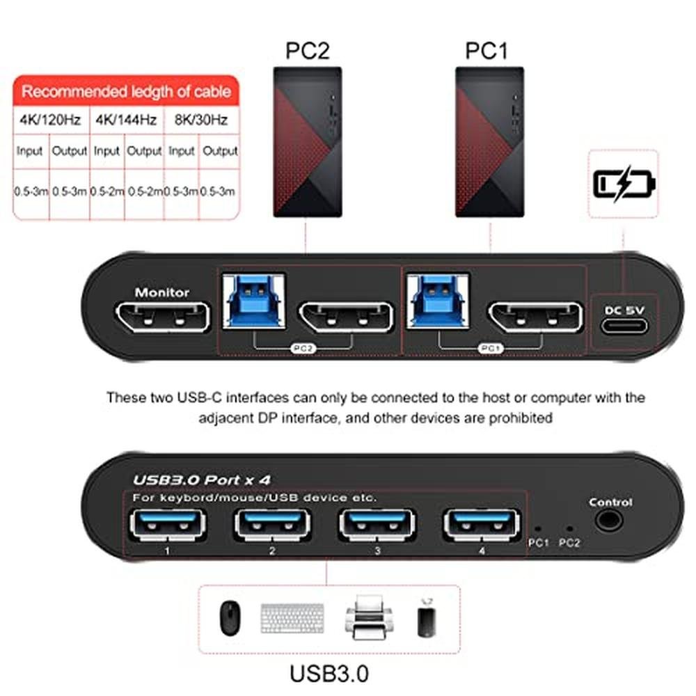 - 2 Port KVM Displayport 165hz: KVM Switch Displayport 2 Computers 1 Monitor sharing one set of keyboard & mouse, 1 DP2.0 or DP 1.4 monitor, and 2 pcs USB 3.0 peripheral devices. 2 pcs USB 3.0 hub (data transferring rate up to 5Gbps/s ,10 times faster than USB 2.0), 2 kits cables and a wire remote push button switch@144Hz,3840*1080@240Hz,and the lower resolution is not recommended . Drive-free for Windows 10/7/2000/XP/Vista, Linux, Mac
