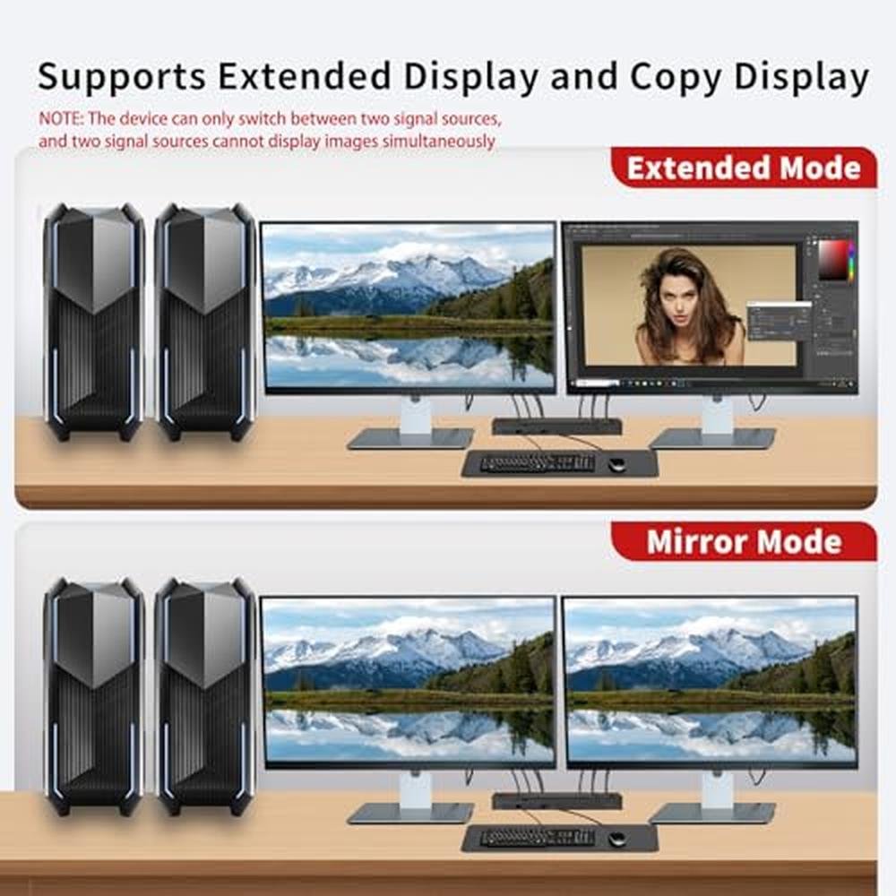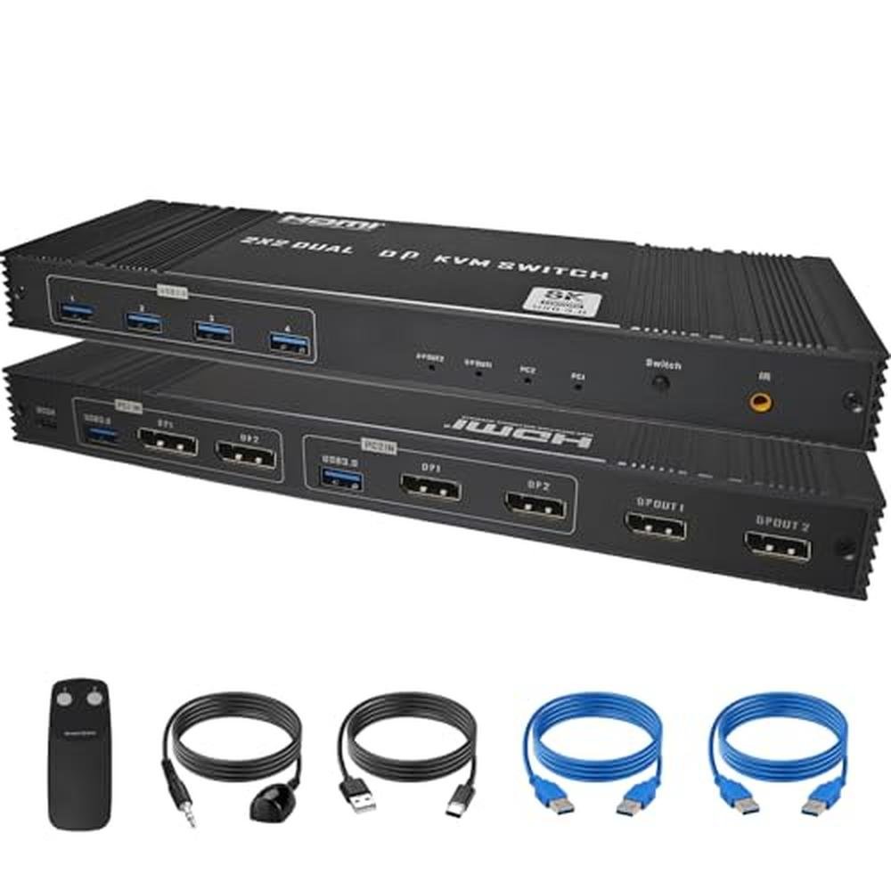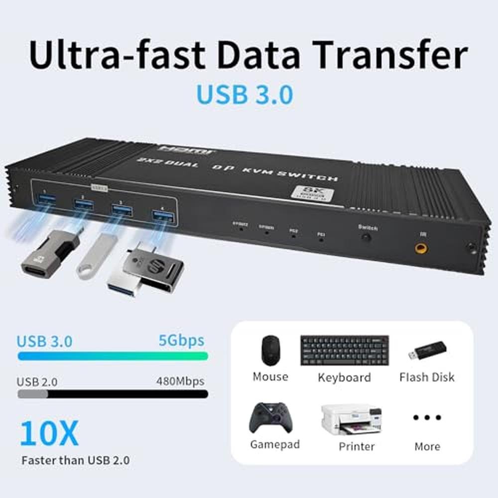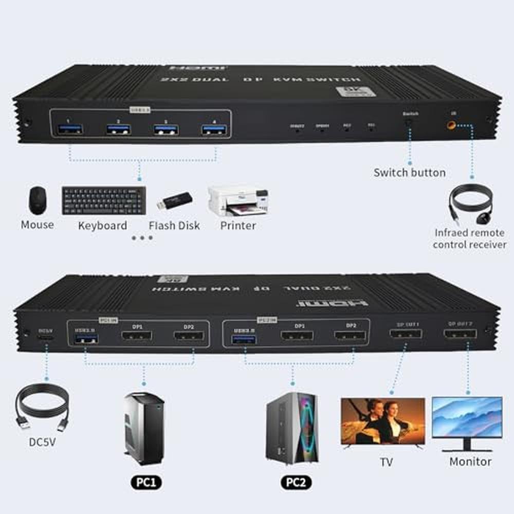 Displayport KVM Switch 2 Monitors 2 Computers, DP1.4 KVM Switch for Sharing 1 Set of Keyboard Mouse with 4 USB3.0 Ports, 8K@60Hz 4K@120Hz HD Dispaly, Support Copy/Extend Mode, Include IR Controller and 2 USB Cables Using only 1 set of keyboard, mouse to control 2 computer devices and 2 monitors. Available to use keyboard and mouse without any delay after switch input sources. With 4 USB 3.0 hub port, it is possible to connect bar code scanner, USB hard drive or other USB devices to KVM. Support resolution up to 7680*4320@60Hz. Support USB 3.0 transmission rate up to 5Gbps. Support Remote Control or Button Switch to switch inputs. Support Windows/Vista/XP and Mac OS, Linux and Unix, Plug and Play.