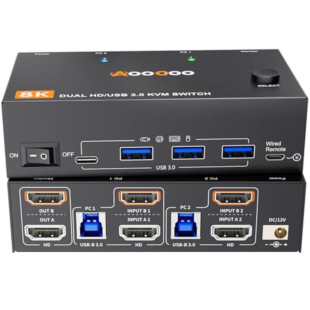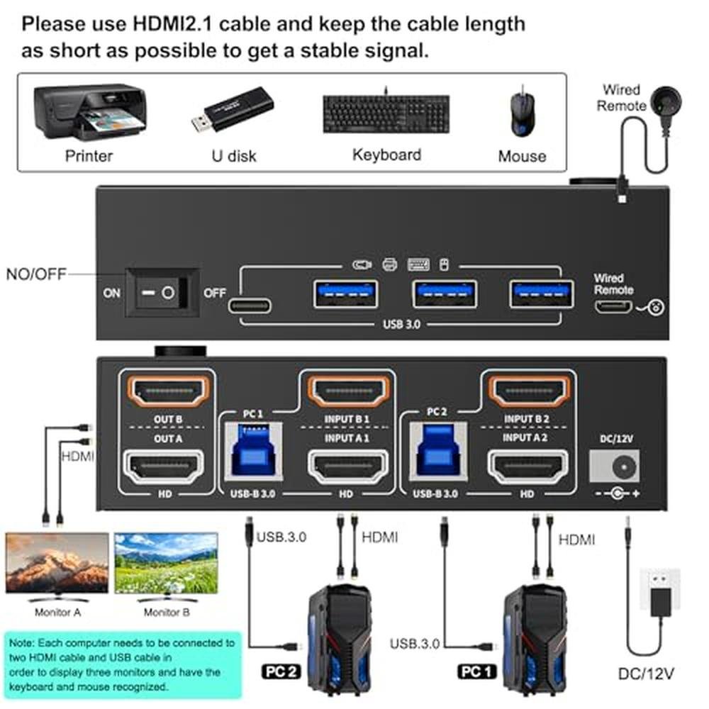 Dual Monitor KVM Switch 8K@60Hz 4K@120Hz HDMI USB 3.0 KVM Switch Extended Display 2 Monitors 2 Computers KVM Switches with USB 3.0 Cables Wired Controller