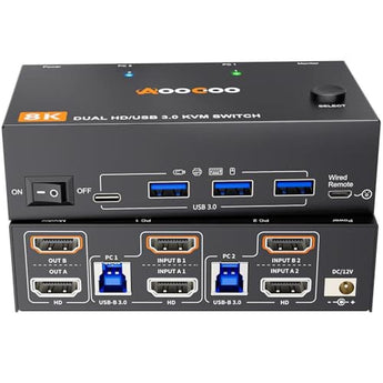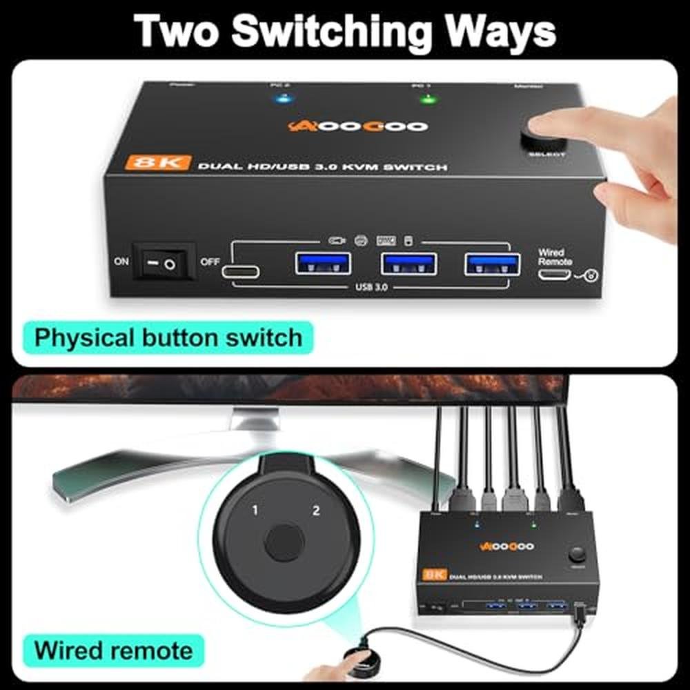 • Compatibility & 2 Switching MethdosAOOCOO dual monitors KVM driver-free and plug and play. you can press the button on the panel or use the wired remote controllerincluded in the package to switch the computers.Two color lights indicate the active computer.