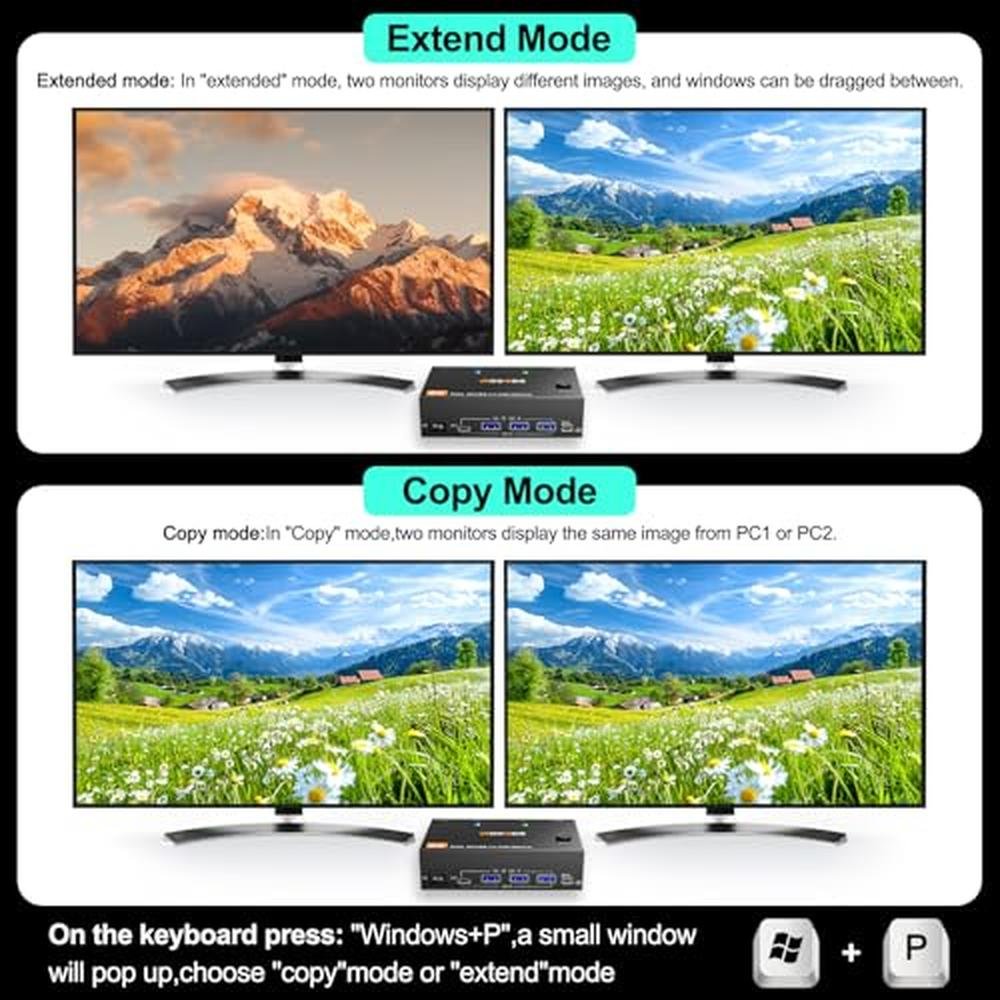 • 8K Dual Monitor KVM Switch This dual monitor KVM switch perfect for hooking up 2 desktops or laptops to share one set of wired or wireless keyboard mouse and 2 monitors (supports extended and mirrored display modes). Please Note That: extended mode can output two different screens and mirror mode can output two identical screens.