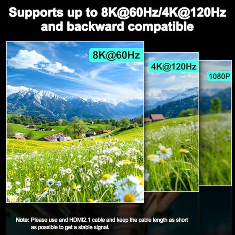 • HD 8K@60Hz/4K@120Hz KVM Switch Dual Monitors HDMI KVM Switch supports resolution up to 8K@60Hz/4K@120Hz, backward compatible with lower resolution.Note: Final resolution is also subject to graphic cards, monitors, cables and adapters.Please connect the two HDMI ports of the independent graphics card. If one port is on the independent graphics card and one HDMI port is on the integrated graphics card, it will not work.