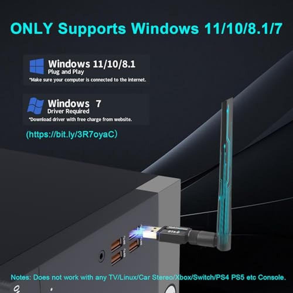 - The adapter is recommended for use with Bluetooth headsets, headphones, speakers, keyboards, mice, smartwatches, printers, and mobile phones/tablets, and is not compatible with Mac OS, Linux, car-stereo systems, TVs, game consoles, and Windows 8/XP/Vista.