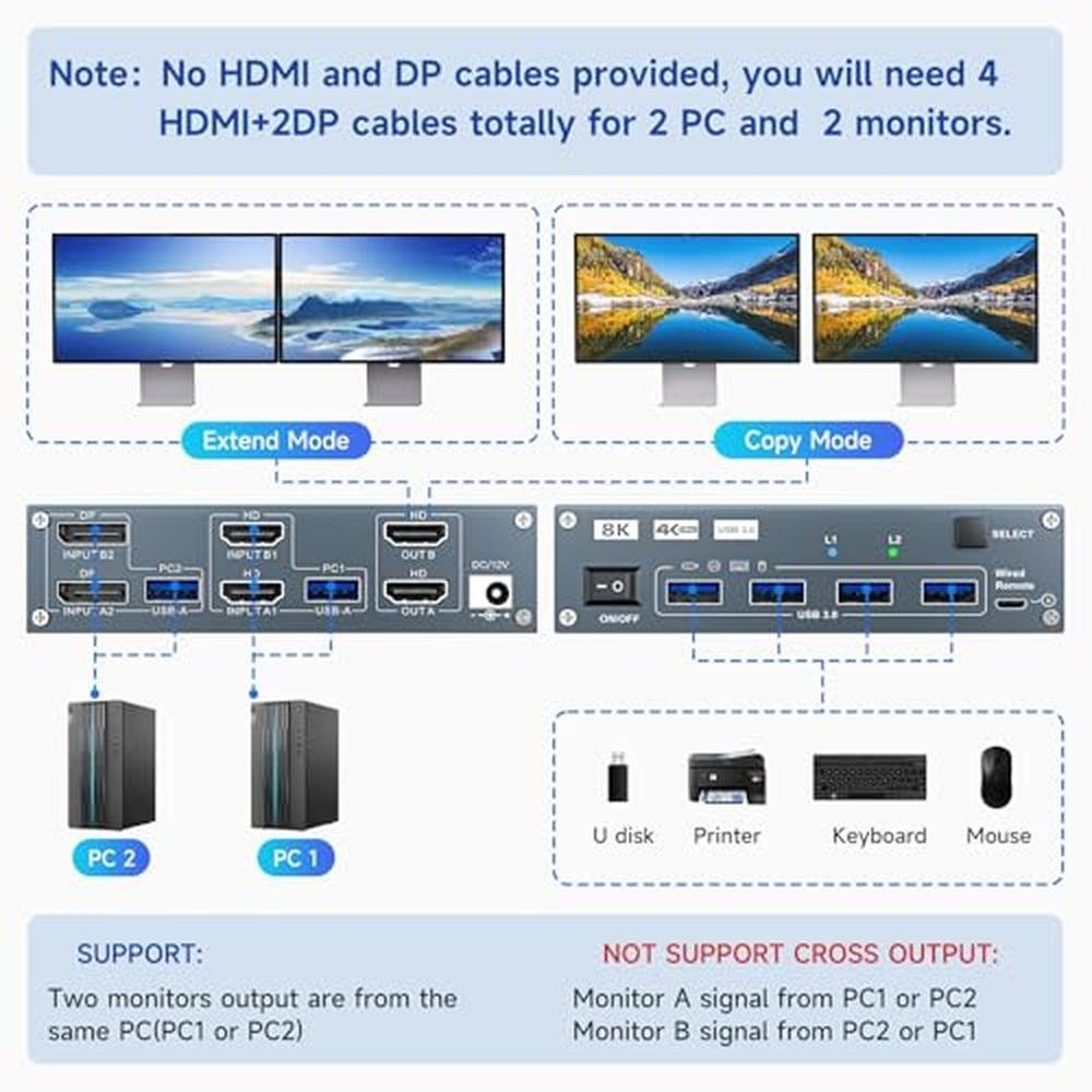 kvm switch 2 monitors 2 computers 8K@60Hz 4K@144Hz, dual monitor KVM Switch with 4 USB 3.0 Port for keyboard mouse and printer