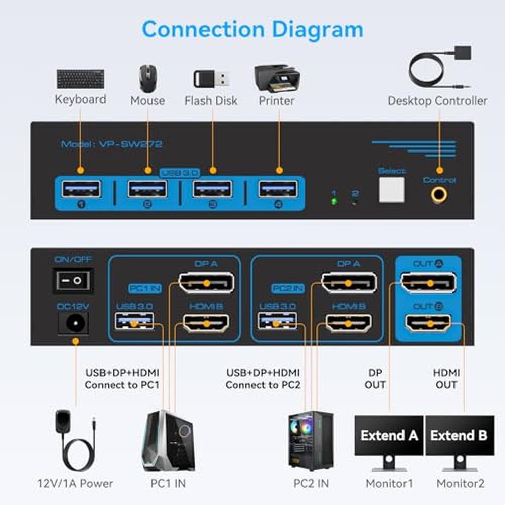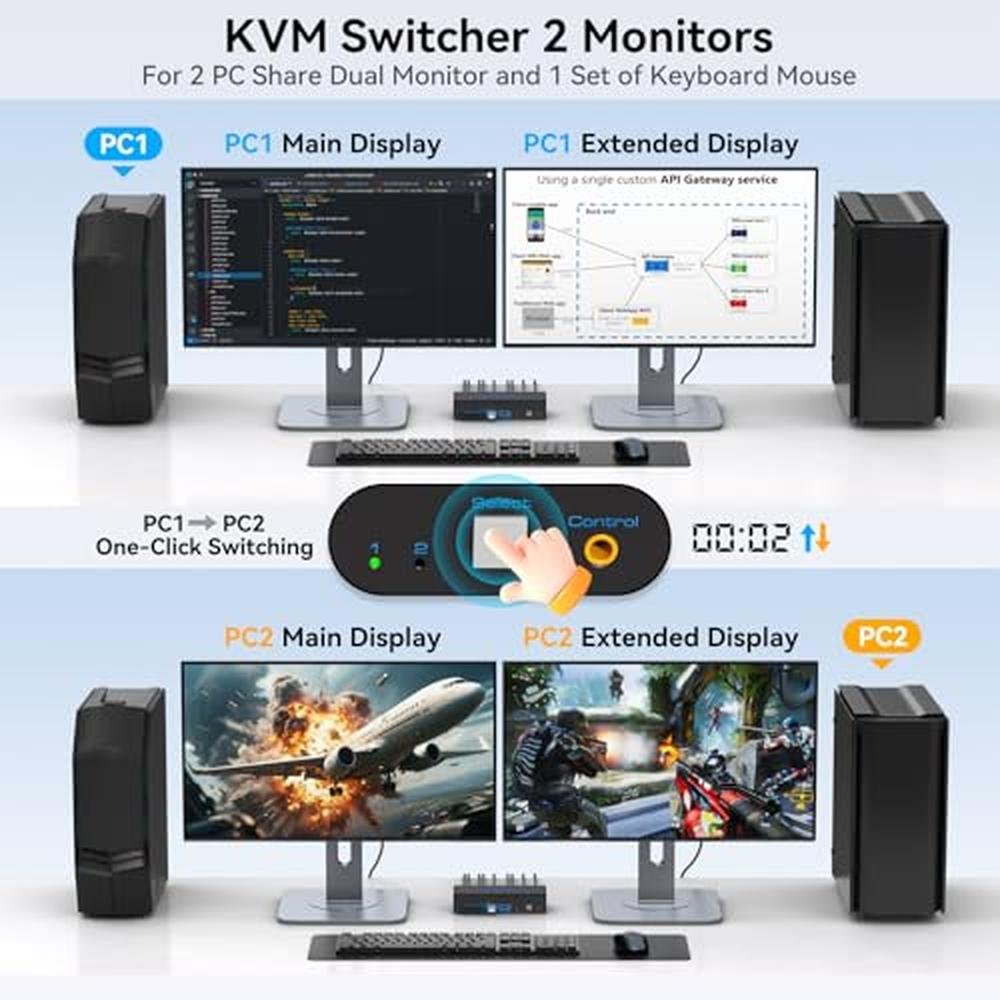 - Dual MonitorsThe KVM switch 2 monitors 2 computers for DP and HDMI ports device to share keyboard mouse and monitor. KVM switches support Extended&Copy Mode. Note: Please make sure your computers/laptops/docking stations have DP+HDMI port (HDMI input can only be output to a monitor with HDMI, DP input can only be output to a monitor with DP). The DP A and HDMI B ports must be connected to the same computer. For compatibility reasons, it is not recommended to use the KVM switch on Mac devices