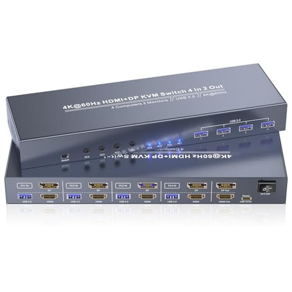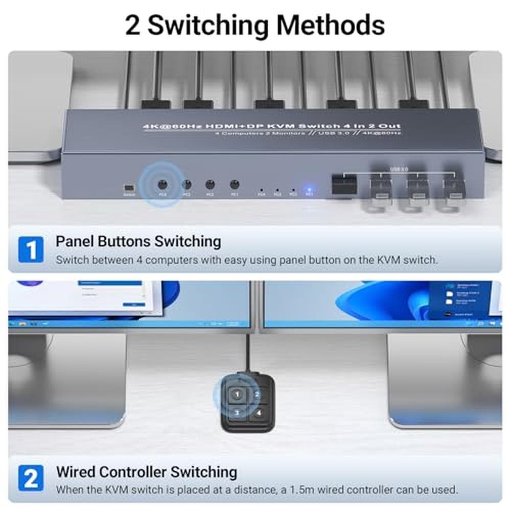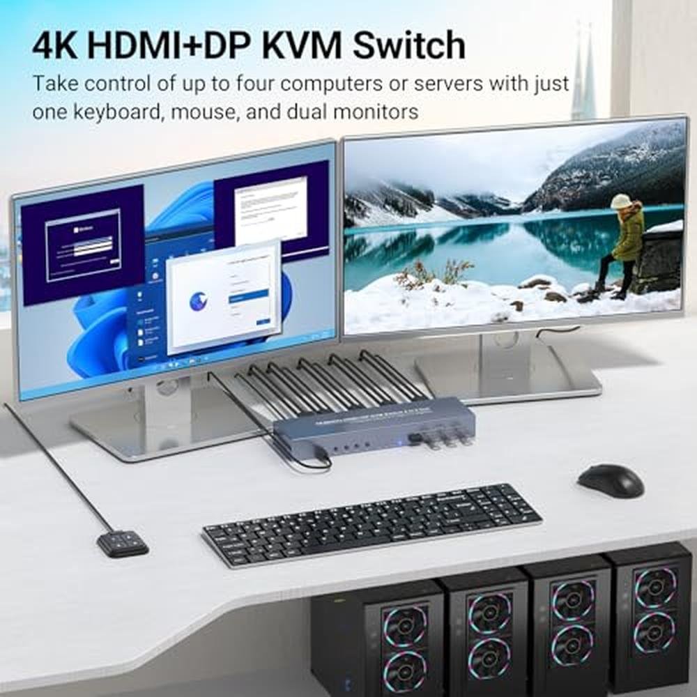 4K@60Hz HDMI + Displayport KVM Switch 2 Monitors 4 Computers with 4 Port USB 3.0 for Peripherals 4-in-1 Command Center for Controlling 4 Computers on Dual Monitors This 4 port HDMI + Displayport KVM switch allows users to run four systems on two monitors with one keyboard and mouse. Whether you're a professional juggling multiple workstations, a gamer needing quick access to different setups, or a tech-savvy user looking to streamline your home office, this dual monitor KVM switch is designed to enhance your productivity. Features: 1.Video Ports: 4 x HDMI input & 4 x DP input for 4 computers, 1x HDMI output & 1x DP output for 2 monitors 2.Resolution Support: 4K@60Hz, 4K@30Hz, 1080i/p@60Hz, 720p@60Hz, etc. 3.USB Ports: 4 x USB 3.0 Type-A (front-mounted) 4.Switching Methods: Front buttons or remote controller 5.Dual Monitor Requirement: Each PC needs HDMI + DP ports for dual display 6.Pro Move: Grab high-speed HDMI cables (certified for 4K@60Hz) to keep your setup smooth. Dual Monitor Setup Expand your workspace with two screens running side by side! Pro tip: Each PC needs both HDMI and DP portsconnect both to the dual monitor KVM switch for dual-monitor magic. Skipping one port? Only one screen will work. Ideal for multi-tasking: code on one monitor, stream on the other. 4K@60Hz Visuals That Blow Your Mind Crisp 4K resolution at 60Hz makes everything popwhether youre editing 4K videos or gaming. Backwards compatible with lower resolutions (1080p, 720p), but heads up: Use 4K-certified HDMI cables to unlock full 4K goodness. Blazing-Fast USB 3.0 for All Your Gear With four USB 3.0 ports (5Gbps10x faster than USB 2.0!), this KVM switch 4 computers let you share printers, external drives, webcams, and more across all four computers. Plug-and-play means zero driver dramajust connect and go. Two No-Fuss Switching Methods Front Buttons: Tap to switch between PCs in a flash. Remote Controller: no need to lean over your desk. Note: Hotkey switching is not supported! Plug and Play, Universal Compatibility This 4 port HDMI DP KVM switch is designed to work out of the box with no additional software or drivers. It's compatible with a wide range of operating systems, including Windows, m-a-cOS, and Linux, making it a versatile addition to any setup. Just plug in your HDMI and DisplayPort-equipped computers and monitors, and you're ready to go.