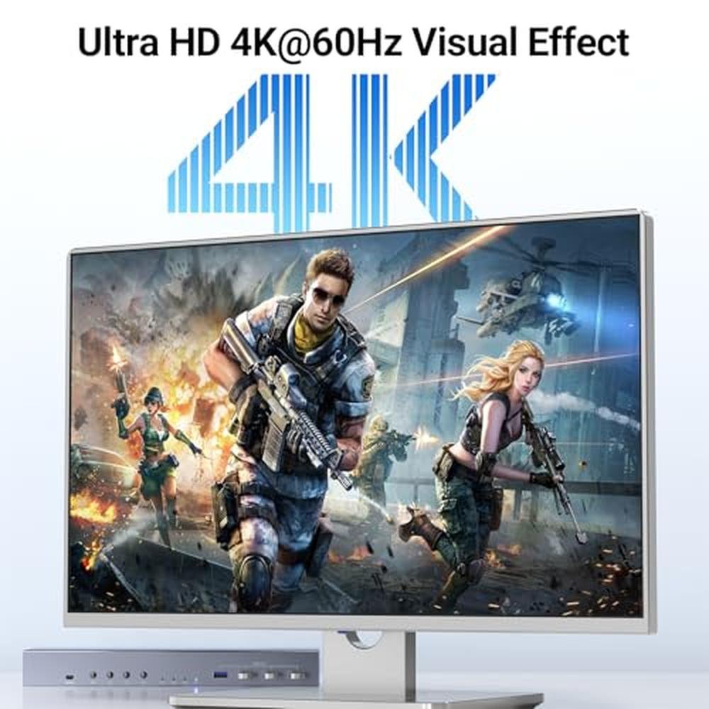 - Ultra HD 4K VisualsExperience crystal-clear visuals with support for up to 4K@60Hz resolution. Whether you're editing high-resolution videos, running complex simulations, or simply enjoying your favorite movies, the 4K 4 port KVM switch delivers stunning, detailed images. It's backward compatible with lower resolutions like 4K@30Hz, 1080P@60Hz, 1080I@60Hz, and 720P@60Hz, ensuring versatility and future-proofing.