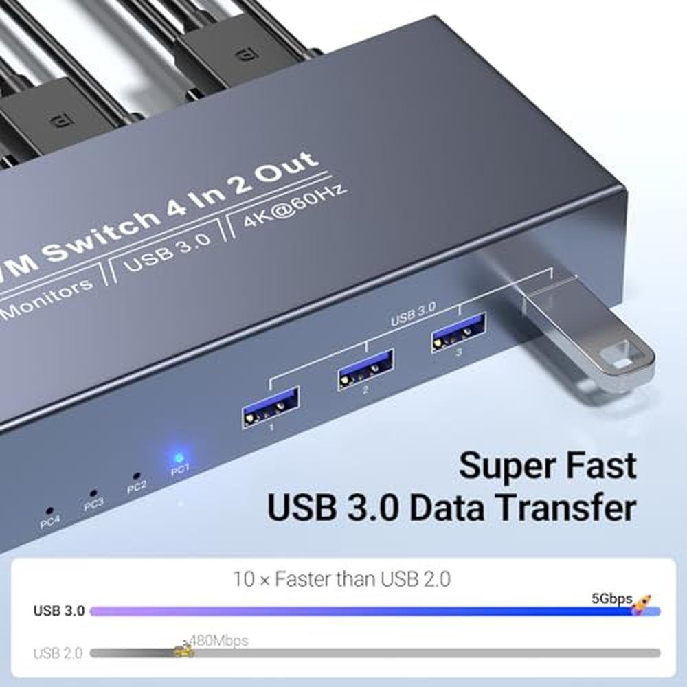 - Lightning-Fast USB 3.0 ConnectivityWith 4 USB 3.0 ports, you can connect and share peripherals like keyboards, mice, webcams, printers, and storage devices across all connected computers. The USB 3.0 ports offer blazing-fast data transfer speeds of up to 5Gbps, which is 10 times faster than USB 2.0. This ensures that your peripherals are always ready and responsive, enhancing your overall workflow.