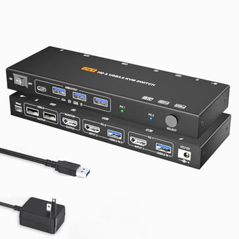 SKU | BM4 USB 3.0 portsKVM switches features 4 USB 3.0 and 2 USB2.0 ports for ultra-fast data transfer speeds of up to 5Gbps. It allows you to seamlessly share peripherals like printers and external drives between two computers, reducing clutter and enhancing efficiency. Ideal for sharing USB devices such as keyboards, mice, scanners, printers, and flash drives, this switch automatically detects and matches connected devicesNOTE:Keyboard and mouse connected to the black USB2.0 port |