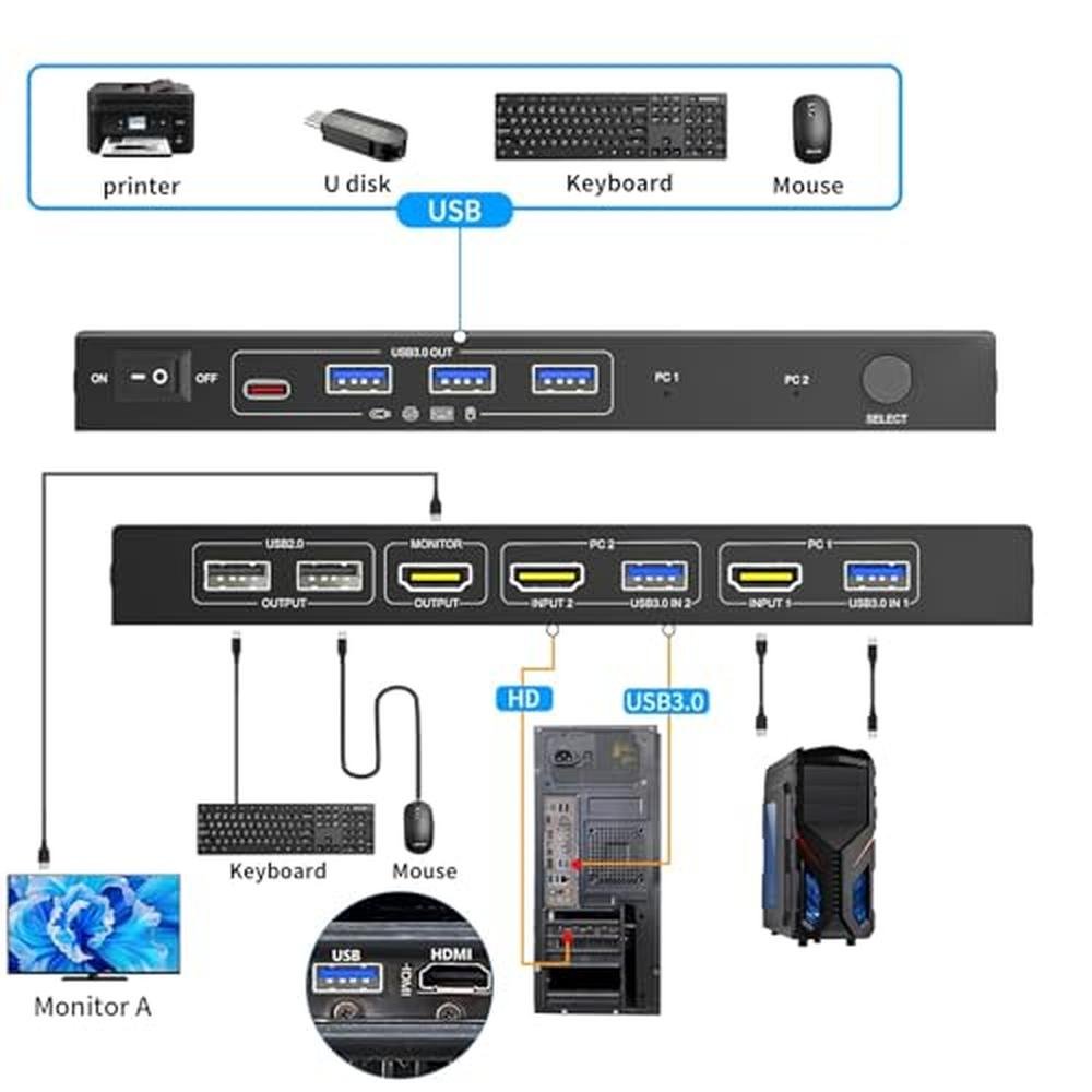 - KVM Switch 1 Monitors 2 Computers: This HDMI KVM Switch can control 2 computers to share 1 monitor and 4 USB 3.0 and 2 USB2.0 devices. such as a set keyboard, mouse, hard drives, U disk, and printer. It's not only a keyboard mouse switch Switch, but also an HDMI switch. You can easily switch between two hosts, which keeps your workspace tidy, and helps to maximize productivity
