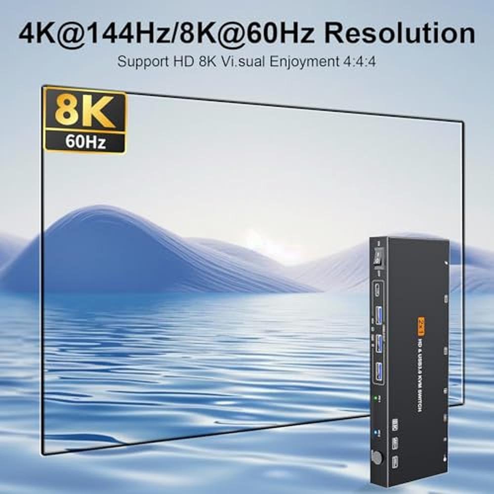 - Ultra HD 8K ResolutionThe HDMI KVM switch supports resolutions up to 8K@60Hz,4K@144Hz, allowing images to be displayed more beautifully and realistically, and colours will be more vivid and dynamic, and backward compatible with 3840*2160@144Hz, 1920*1080P@240Hz, 1920*1080P@240Hz, etc. Note: KVM requires a high-quality HDMI 2.0 standard cable no longer than 3.3 feet in length, and ensure that your computer and monitor support 8K to ensure the transmission of video signals!