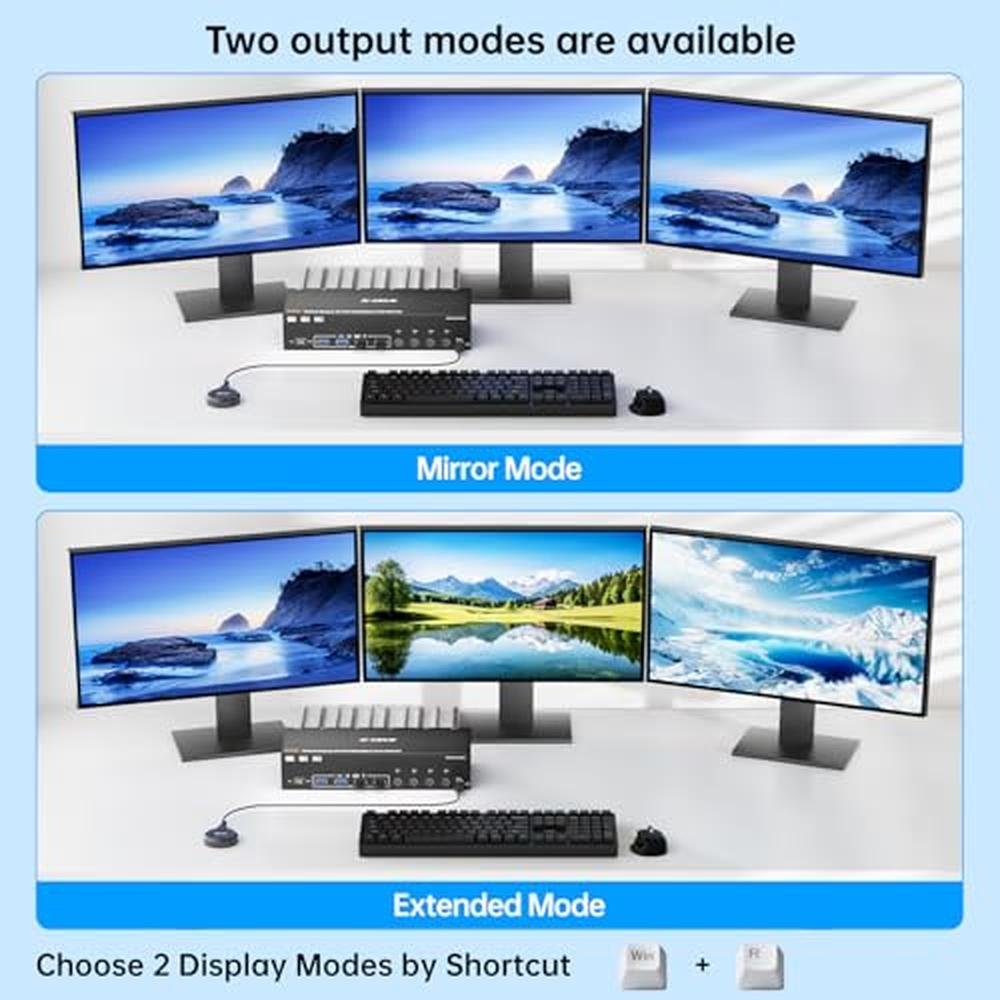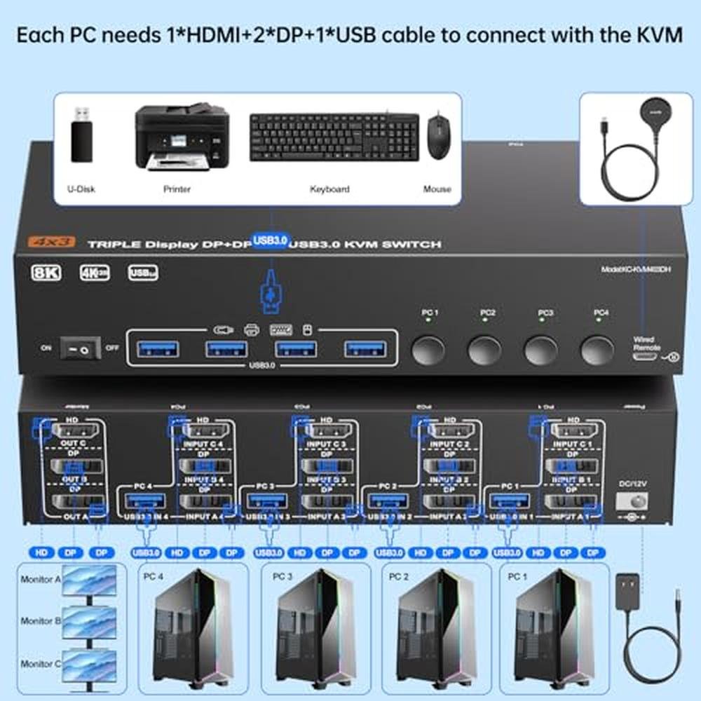 KVM Switch 3 Monitors 4 Computers 8K@60Hz 4K@144Hz, HDMI +2 Displayport Triple Monitor KVM Switch with 4 USB Ports for Keyboard Mouse,Support Extended/Copy Mode, with Wired Remote and 4 USB Cables