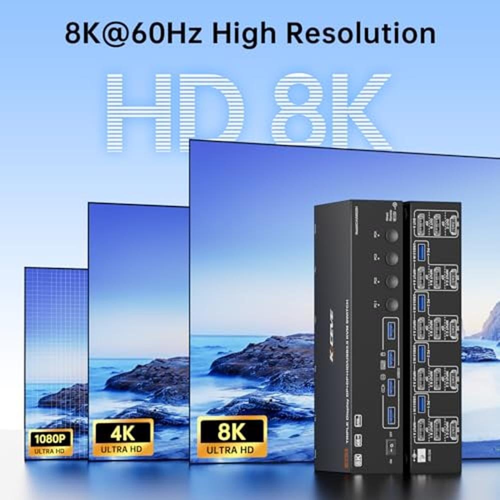 - Ultra HD 8K Visual EffectTriple monitor KVM switch 4 port supports up to 8K@60Hz, with backward compatibility for 4K@144Hz, 4K@120Hz, and 1080P@240Hz. (Note:Please use HDMI2.1 and DP1.4 cables for a better experience, shoif the set distance allows,the length of cables more short more better.)