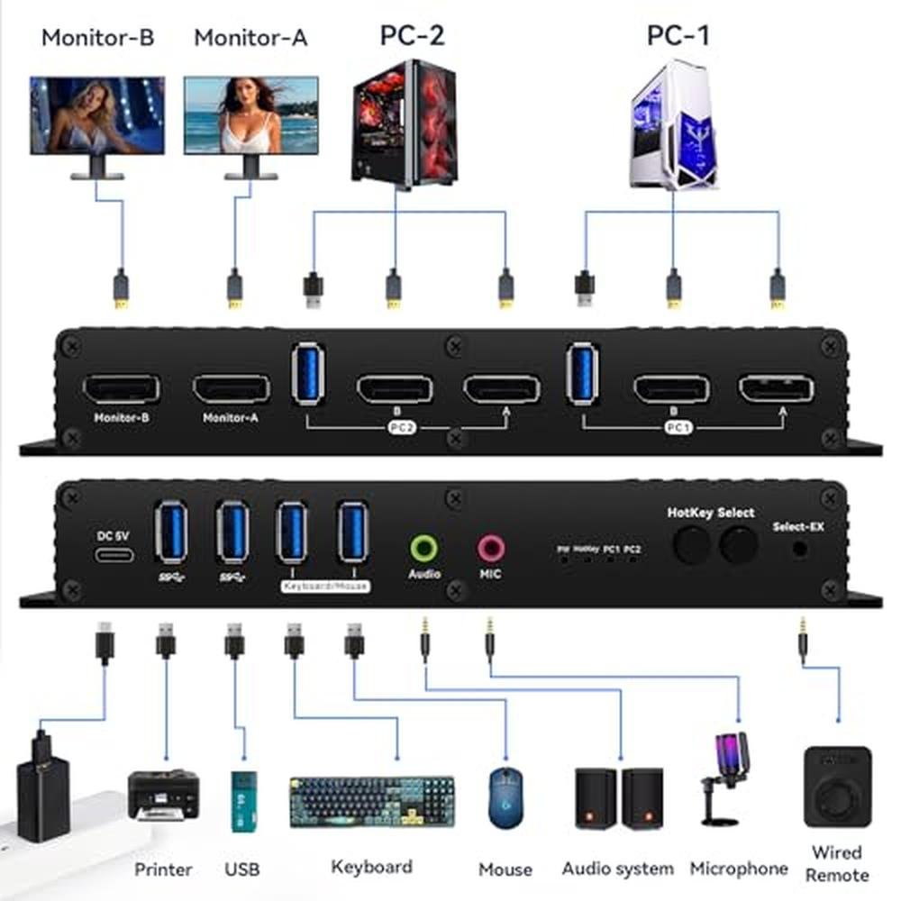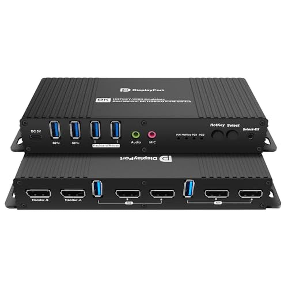Kvm Switch Displayport EDID 2 Monitors 2 Computers 4K 144Hz Hotkey Switching Edid Displayport kvm Switches Dual Monitors dp 1.4 1440P 144Hz 165Hz 240hz Hotkey Switching