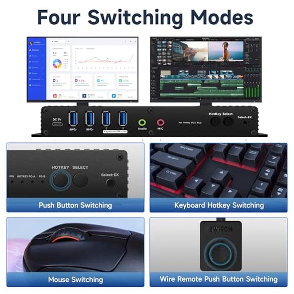- kvm Switch 2 Monitors 2 Computers display port edid 4k 144hz SWITCH Mode: the Dual Monitor kvm Switch displayport 4k 144hz Supports Four switching methods to meet with different needs, including keyboard hotkeys, mouse hotkeys, push button, wired remote ; switching only takes several seconds after first set-up;