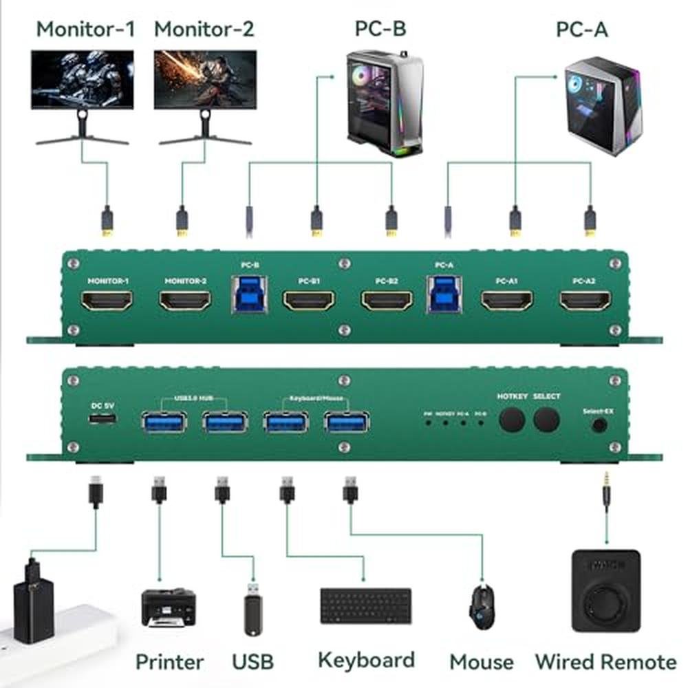 It is HDMI2.1 2 Port KVM HDMI2.1 2 in 2 out. The KVM Switch 2 Computers 2 Monitor HDMI sharing one set of keyboard & mouse, 1 HDMI2.1 monitor, and 2 pcs USB 3.0 peripheral devices. 2 pcs USB 3.0 hub (data transferring rate up to 5Gbps/s ,10 times faster than USB 2.0), 2 kits cables and a wire remote push button switch.The HDMI KVM Switch is Recommend resolution 5120x1440@60Hz, 5120x1440@75Hz,5120x1440@120Hz,5120x1440@144Hz,5120x1440@165Hz,3440x1440@75Hz,3440x1440@100Hz,3440x1440@144Hz,3440x1440@165Hz,3440x1440@175Hz,7680x4320@60Hz ,3840*2160@60Hz,3840x2160@144hz,3840x2160@175hz,3840x2160@240Hz ,2560*1440@165Hz,2560*1440@144Hz,3840x1600@144Hz,3840x1600@165Hz,3840*1620@144Hz,3440*1600@144Hz,3840*1080@240Hz,and so on. The KVM HDMI 2 PC 2 monitor Switch for 2 Computers Dual Monitor,manual button switching, wired remote push button switching.The KVM switch HDMI 2 Port: Support long HDMI2.1 Cables, The kvm switch HDMI has auto EQ,Support long HDMI2.1 Cables 4k 144Hz 2K165Hz 1440P 120Hz 144Hz 165Hz 175Hz 240Hz , HDMI input 3M , HDMI Output 3M For RTX3060, RTX3070,RTX3080, RTX3090,RTX4080,Support FreeSync G-SYNC.The 2 Port Kvm Switch HDMI can support EDID clone. The HDMI Kvm Switch can support type-c to hdmi. The kvm switch can support DP TO HDMI output.It can support HDMI TO DP,too.It must use hdmi2.1 Cables,and use the accessory cable for output.the kvm switch 2 monitors 2 computers HDMI can not support hotkey switching