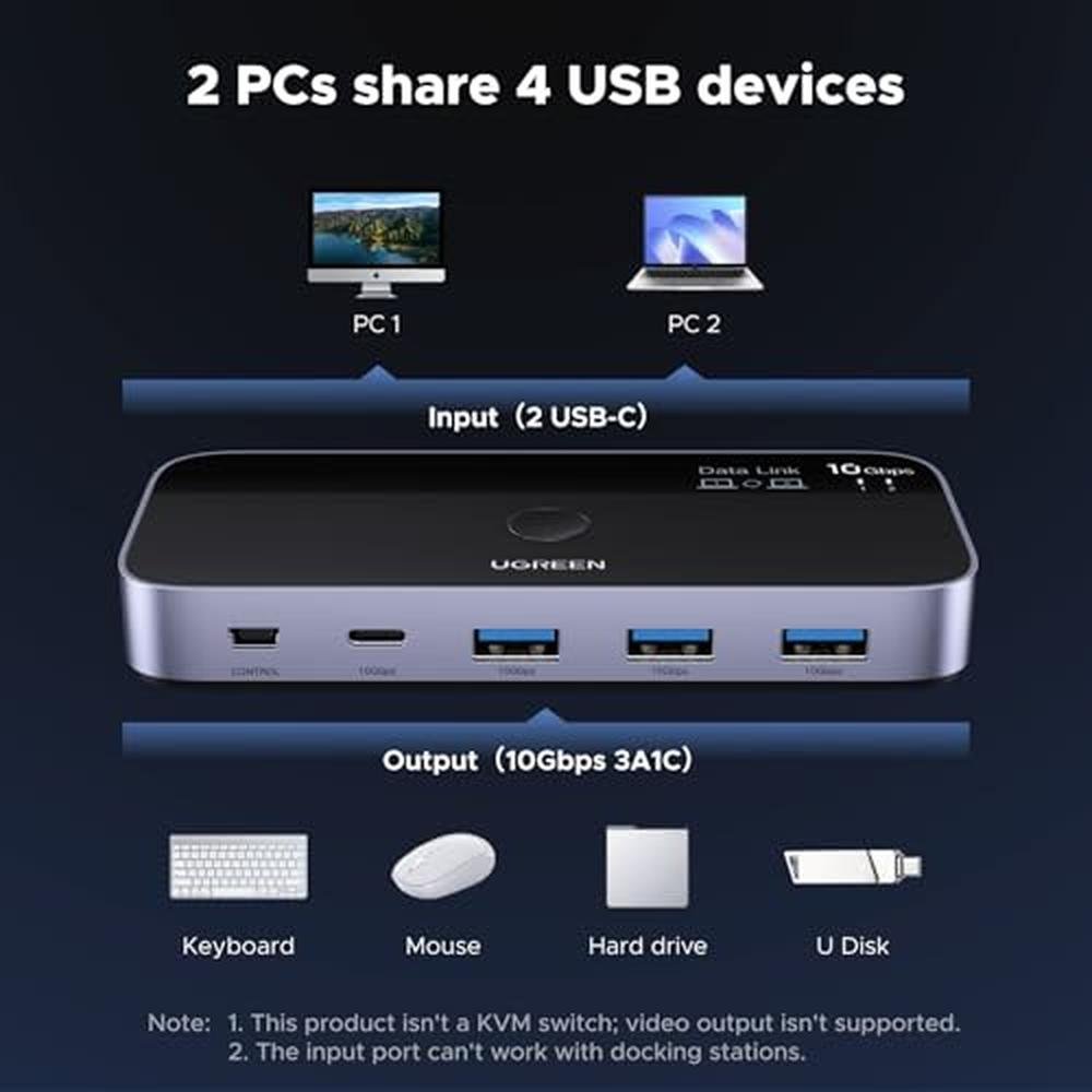2 USB-C PCs Share Multiple Devices: UGREEN 2-In 4-Out USB-C switch supports sharing 4 USB devices like a keyboard, mouse, and headphones between 2 computers. Switch freely between work computer and personal laptop to boost work efficiency. (Not a KVM switch and Not support a monitor) Support File Sync & Cross-Screen Drag: This USB-C switch allows seamless file sync, drag & drop, and clipboard sharing between two computers Streamline your workflow, no more switching USB drives or uploading to cloud storage. (Function depends on system compatibility and mainly works via keyboard and mouse; others do not support such functions. And these features require driver installation.) 10 Gbps Transfer Speed: The USB-C switch is equipped with 4 USB 3.2 Gen 2 ports and speeds up to 10 Gbps. Faster than traditional 5 Gbps USB Switches, transfer 1 GB files in 1.5 seconds to improve work efficiency without waiting. (The USB ports are primarily for data transmission audio connections and charging are not recommended.) Stable Operation with Over-Current Safety: The device features over-current protection with a max output of 2.6A, supporting keyboard, mouse, printer, and hard drives simultaneously without extra power. (Tip: Actual max output depends on the input ports power supply. If the input port is USB 3.0 or 2.0, a lower input current may cause unstable operation.) Connect both USB A & C devices: The USB3.2 switch provides 1 USB-C port and 3 USB-A ports for connecting various devices. 4 USB ports can extend the number of ports for two computers and improve work efficiency. (Do not suggest working with extra USB hubs to prevent insufficient power and unstable performance.) Two Switching Modes: The USB switcher has two switching modesRemote control and button, switch devices freely as you like. You can hide the USB switch to tidy up the desktop and save space, and then use the remote to switch devices.