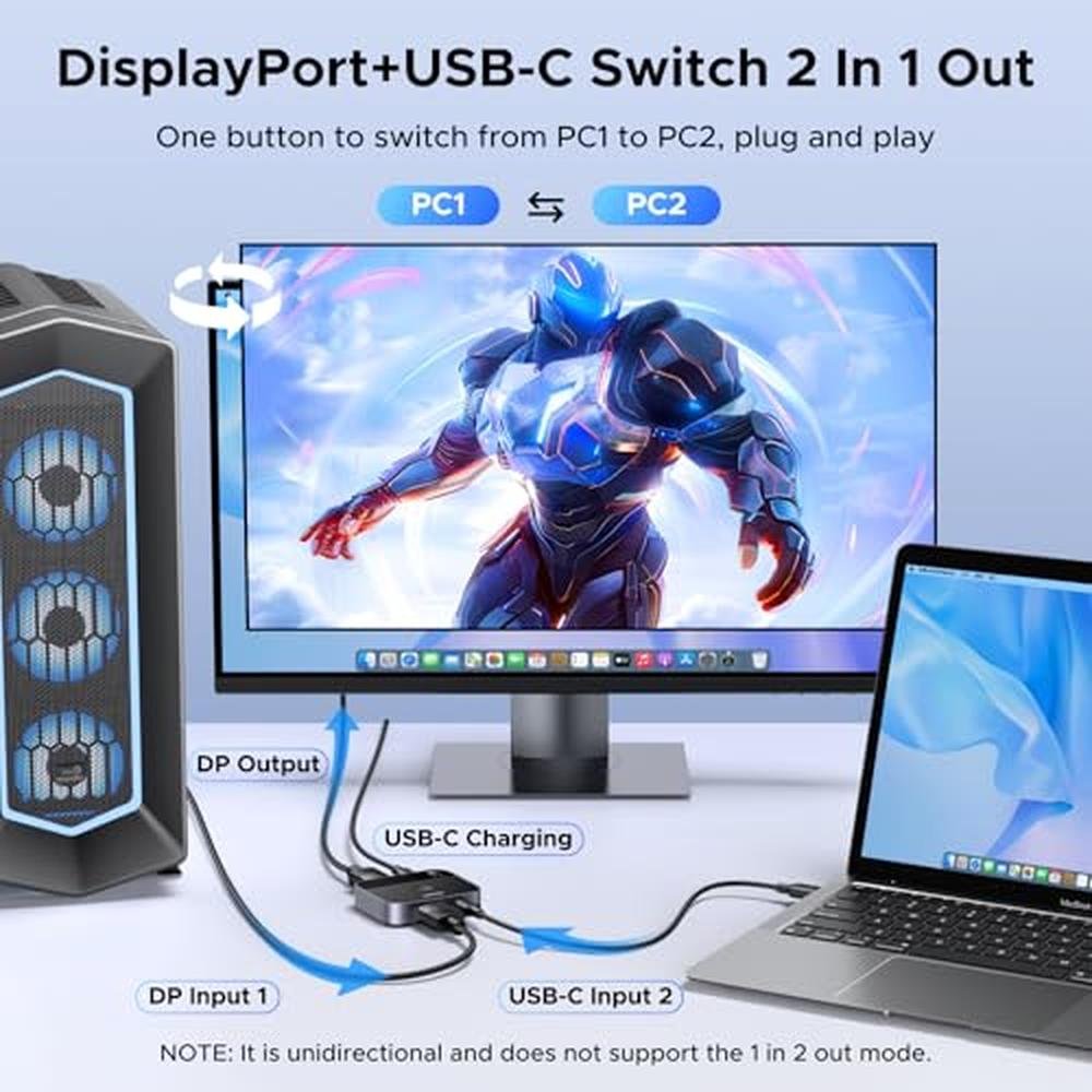 With this innovative DP + USB-C switcher, you can connect two different video sources (one displayport and one USB-C device) to one displayport monitor. USB-C devices such as laptops can be easily connected and switched. It eliminates the hassle of repeated plugging and unplugging, saving your time and enhancing your work efficiency. NOTE: It is NOT Bi-directional, and does NOT support 1 in 2 out mode, so it cannot display on two monitors at the same time.This DisplayPort+USB C switch is perfect for gamers, supporting 8K@60Hz, 4K@240Hz, 4K@120Hz, and backward compatible with 1080P@240Hz resolutions. It also supports 3D, Dynamic HDR, and HDCP2.3. NOTE: If you want to achieve a resolution of 8K, please use a standard DP1.4 cable with a length not exceeding 3 meter.Supporting a high refresh rate of 4K@240Hz, 4K@120Hz, 4K@60Hz, and 1080P@240Hz, etc, this displayport switch supports high bandwidth 32.4Gbps data transmission. It also supports variable refresh rate VRR, which allows the screen's refresh rate automatically adjusted in real time to match the frame rate of the content to avoid screen tearing or stuttering, reduces input lag, and enhances gaming responsiveness.This dp+usb-c switcher is driver-free and widely compatible with Windows, MacOS, and Linux. It is compatible with computers, laptops, tablets, MacBook Air/Pro, PS5 PS4, Xbox One X/Series, Steam Deck, projector, and monitor, etc. Package List: 1*DisplayPort + USB-C switch, 1*USB-A to C power cable, 1*User manual.Note: 1, It is recommended to use a Thunderbolt 4 cable or a full-featured USB-C cable with E-Marker and with a length not exceeding 1 meter. 2, Please check the laptop is awakened from sleep mode before you switch. 3, If you want to achieve a resolution of 8K, please use a standard DP1.4 cable with a length not exceeding 3 meters, and the USB-C cable should not exceed 1 meter. 3, Please be sure to use the included USB-A to C cable to connect to the power supply for normal use. It only includes a charging cable, NOT a power adapter. 4, Not support automatic switch.