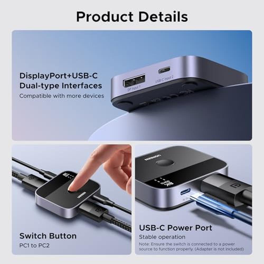 UGREEN 8K@60Hz DisplayPort+USB C Switch 2 in 1 Out DP 1.4 Out Ultra HD Supports 4K@240Hz 3D HDR10+ HDCP2.3 USB-C+DisplayPort Switcher Compatible with Laptops, Computers, Desktop, Steam Deck