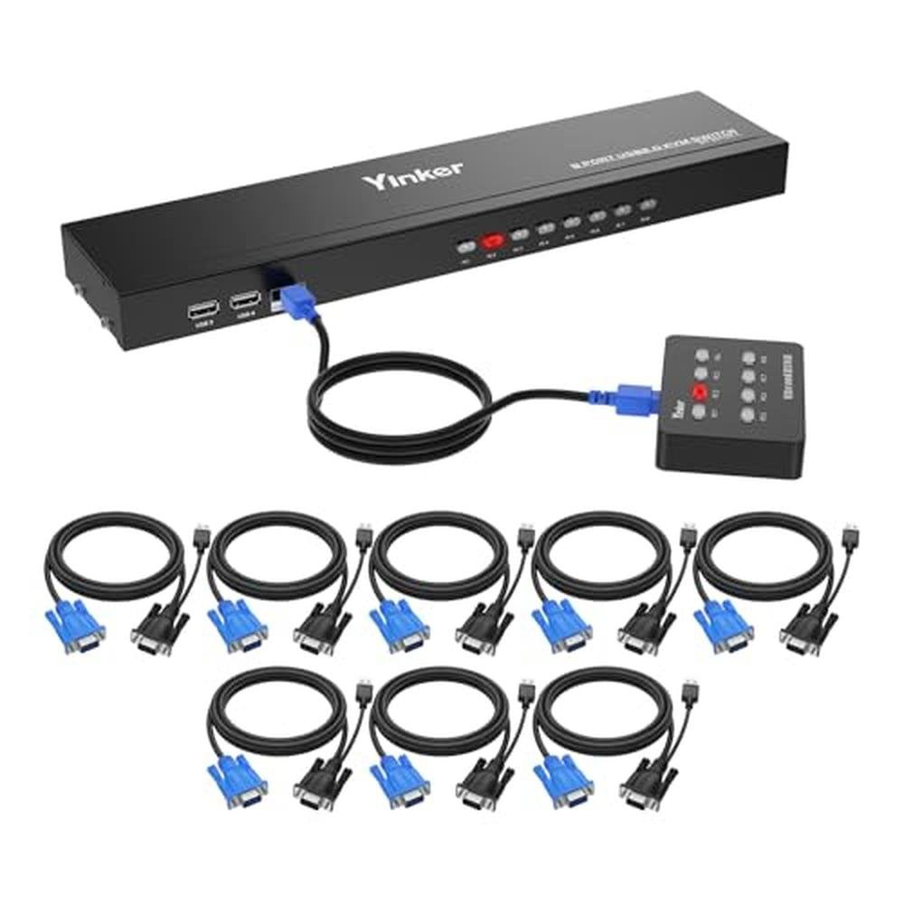 Yinker VGA KVM 8 Port Rackmount Switch + 8 KVM Cables + 4 USB Hubs + Wired Desktop Selector + Rack Mount Ears