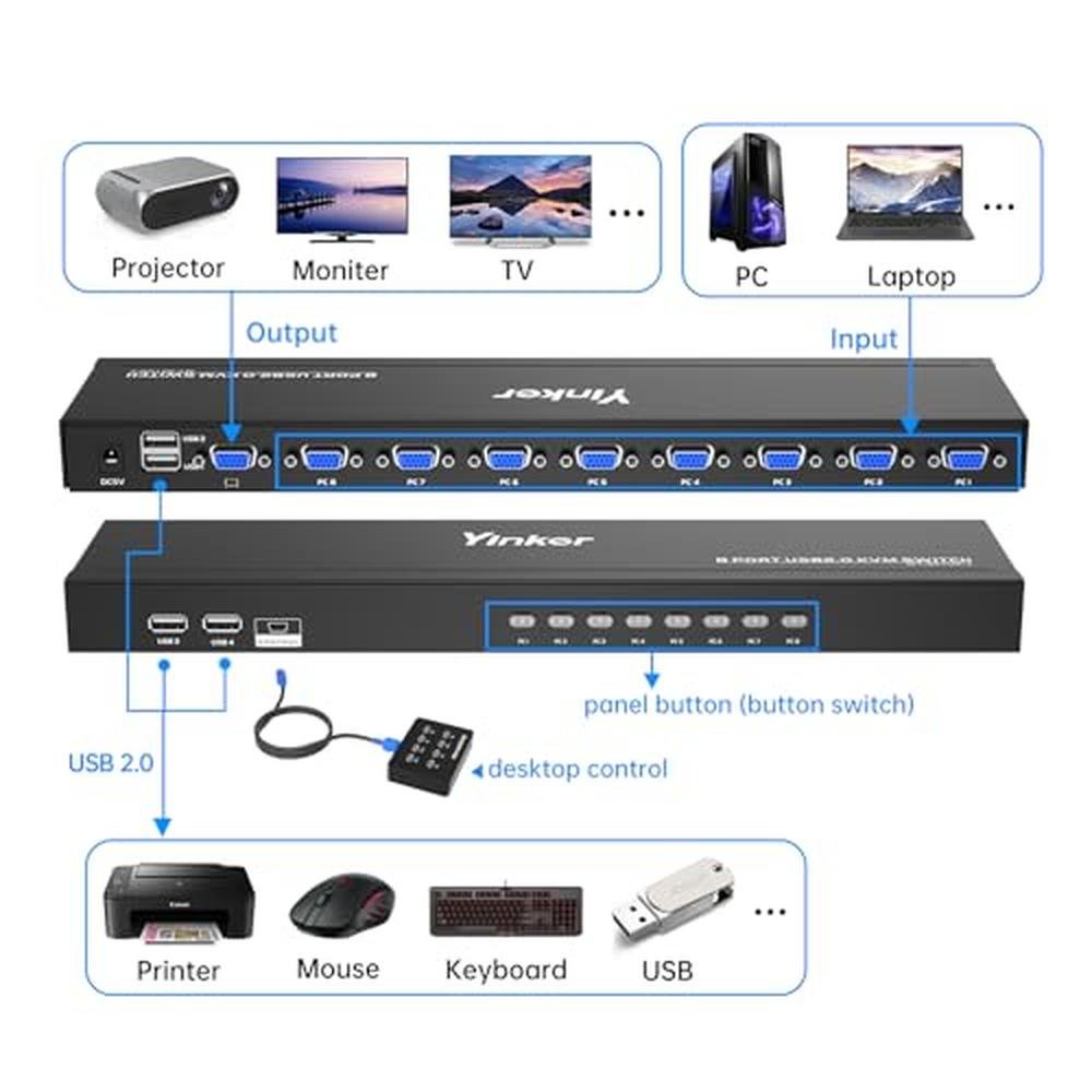 • 8 port USB VGA KVM Switch Yinker allows managing 8 computers with one set of monitor, keyboard and mouse. Also share one USB speaker or other USB devices.