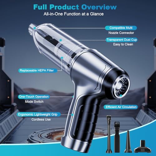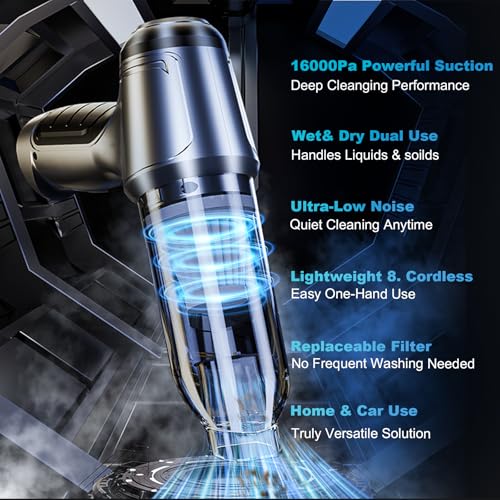 Upgrade your cleaning experience with our Handheld Vacuum Cordless Hand Rechargeable Car Vacuums with Best Suction Held. Featuring a powerful 18000Pa suction, this cordless handheld vacuum tackles dust, pet hair, crumbs, and spills with ease. Pumping and Inhaling -use capability ensures you can clean both solid debris and liquid messes. Enjoy a quieter environment thanks to the ultra-low noise technology, making it perfect for homes with children or pets. The lightweight design is easy to carry and maneuver, whether you're cleaning your home, car, or office. For added convenience, it comes with a replaceable filter that's easy to detach and replace, reducing maintenance efforts and prolonging the vacuums life. Designed to be portable and lightweight, it offers cordless freedom and single-hand operation, making it easy to clean tight spaces, car seats, and household surfaces without restrictions. No more frequent washing needed keep your device running at peak performance effortlessly. Choose our product and enjoy a new level of powerful, quiet, and effortless cleaning!.