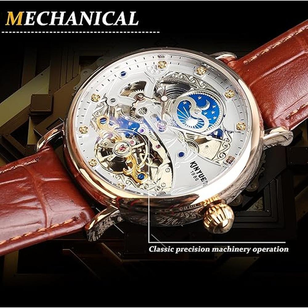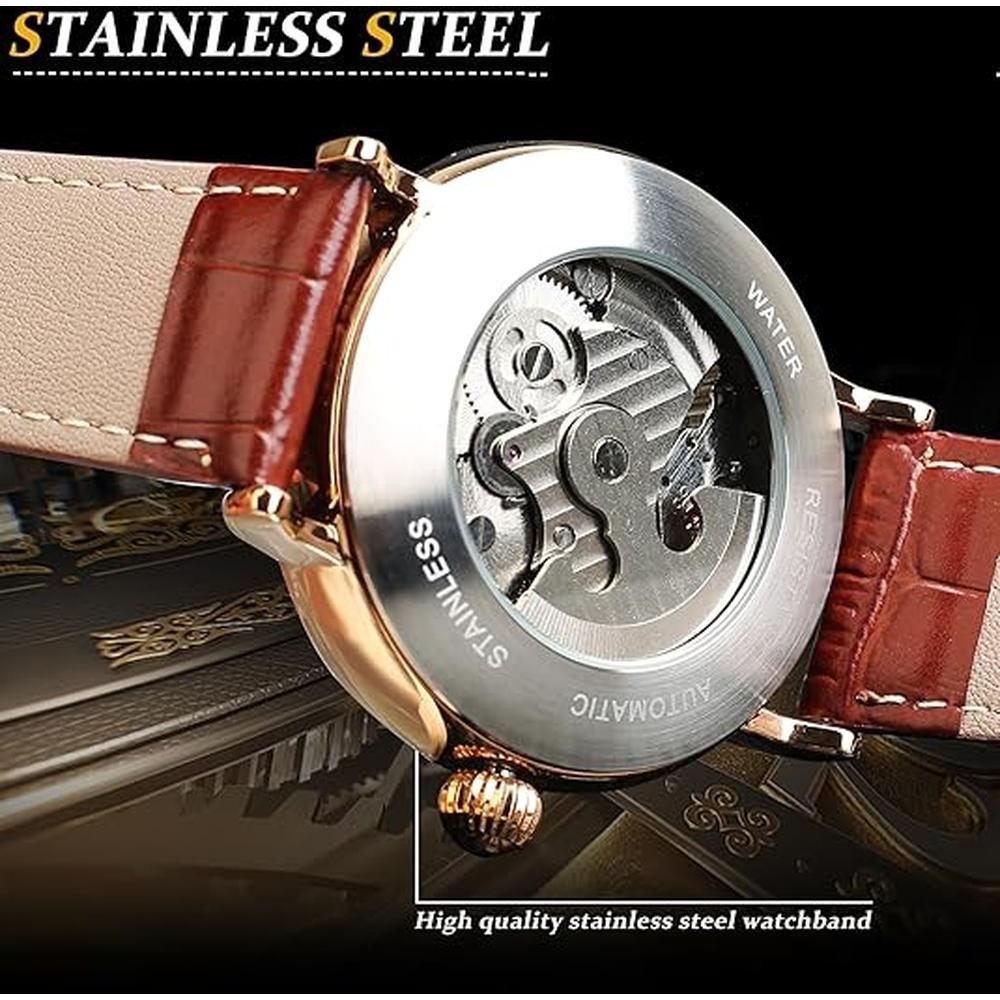 - The watch features a self-winding skeleton mechanism, showcasing intricate details and precision engineering, perfect for those who appreciate the art of watchmaking