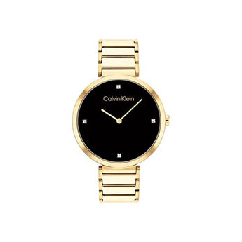 Experience the epitome of style and sophistication with the Calvin Klein Minimalistic T-Bar Women's Ionic Plated Thin Gold Steel Case Quartz Watch. This stunning timepiece boasts an ionic plated thin gold steel case, exuding an air of understated elegance. The matching ionic plated thin gold steel bracelet adds to the watch's sleek, minimalist design, making it a versatile accessory for any occasion. With its quartz movement and high-quality ionic plating, this watch is both functional and durable, ensuring years of reliable timekeeping. The perfect blend of fashion and functionality, this watch is ideal for the discerning woman who appreciates the finer things in life. Whether you're dressing up or dressing down, this watch is sure to make a statement.