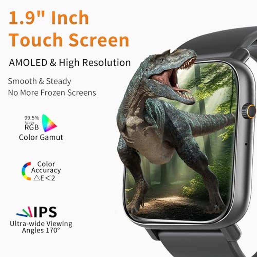 - 1.9-inch Super Large High-Definition ScreenThis smartwatch features a 1.9-inch super large screen, providing a clearer and more comfortable visual experience. The unique button design allows you to better operate the watch to fully experience its features. The industrial design aesthetics of the smartwatch feature a highly durable frame. The package comes with a Silicone strap and a sport loop band; conforming to ergonomics and ensuring comfortable long-term wear.