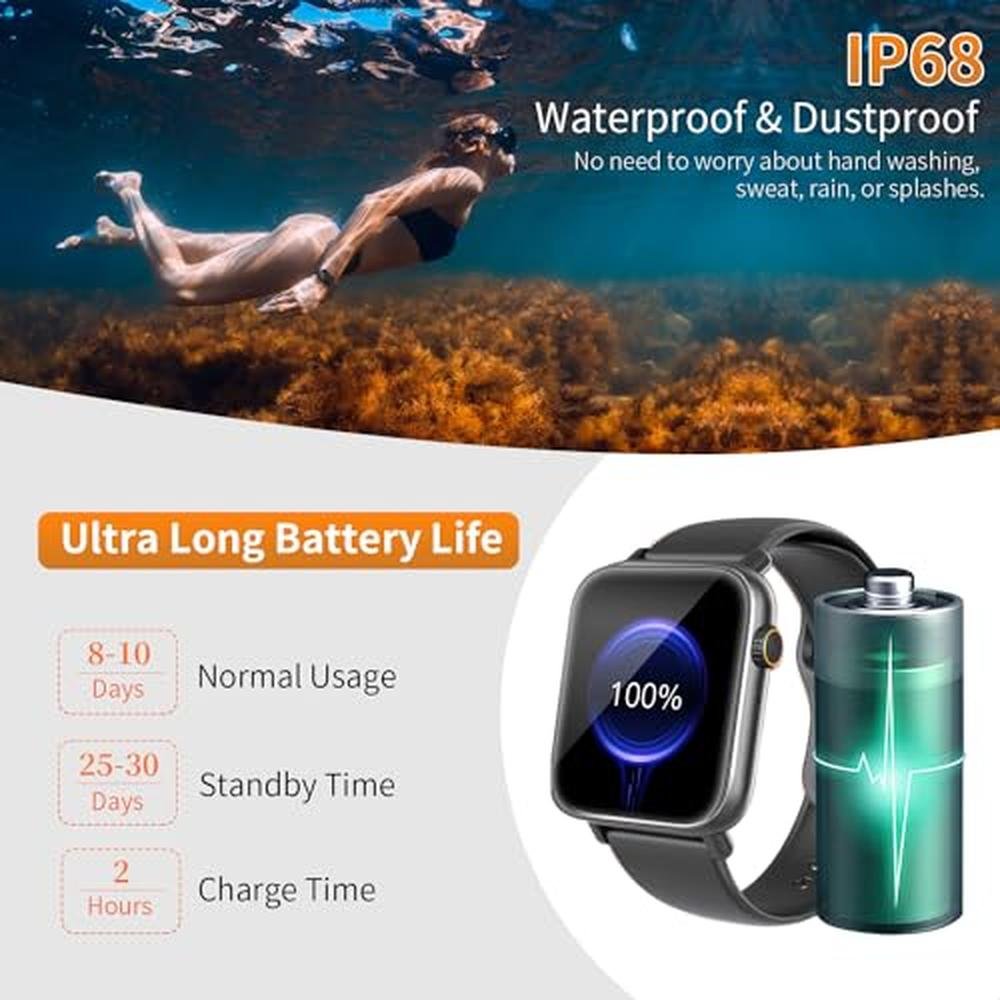 - Multiple Sports Modes/IP68 WaterproofThis smartwatch is fully waterproof, allowing you to wear it even during swiming. It also supports tracking and recording of over 100 sports modes, enabling you to adjust your workout plans based on your activity status, helping you cultivate a love for exercise and maintain a healthy lifestyle. Additionally, the activity tracker automatically tracks your steps and calories burned in daily activities.