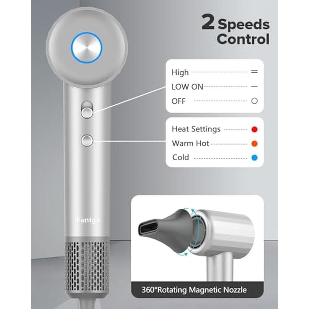 - High-Speed & Fast Drying No Heat Damage Fentgo hair dryer is equipped with 110,000RPM high speed brushless motor, provides a strong wind speed reaches 22m/s, which can quickly dry your hair in 2-8 minutes.Professional hair dryer built-in intelligent temperature control processor, real-time monitoring and regulation of high temperature, to avoid your hair from high temperature damage.