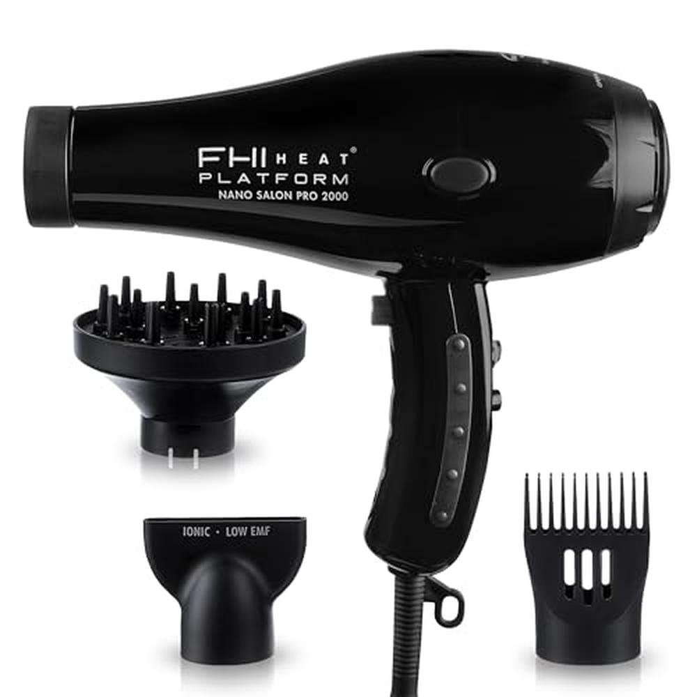 FHI HEAT Platform Nano Power Salon Pro 2000 Tourmaline Ceramic Quick Dry Hair Dryer with 3 Piece Attachment Set (Comb, Concentrator, and Diffuser), Black