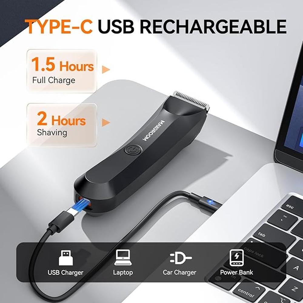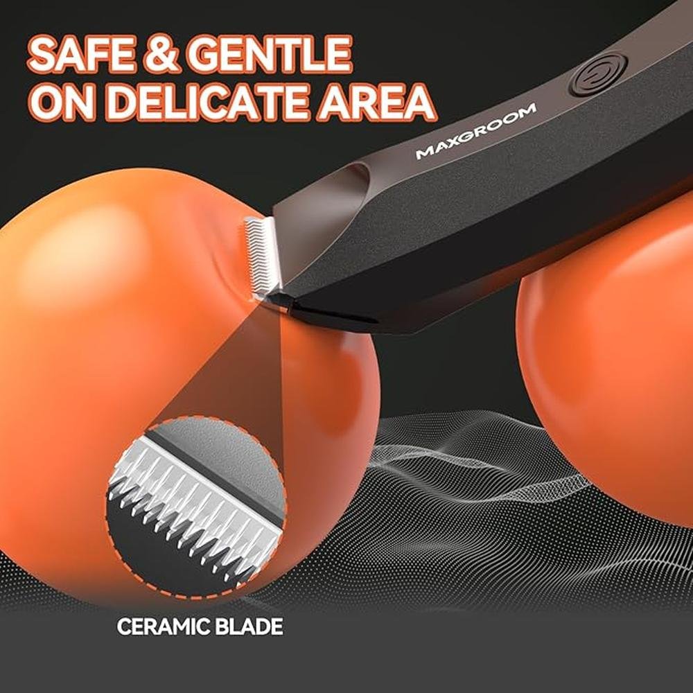- Safe Gentle TrimmingMAXGROOM body hair trimmer features a dual-blade design for precision and comfort The sharp ceramic blade effortlessly cuts through thick hair with high-speed efficiency, while the R-shaped stainless steel blade with rounded tips gently glides over sensitive areas like the underarm, chest, groin, pubic and balls, delivering a soft and safe trimming without nicks, cuts, or scratches.