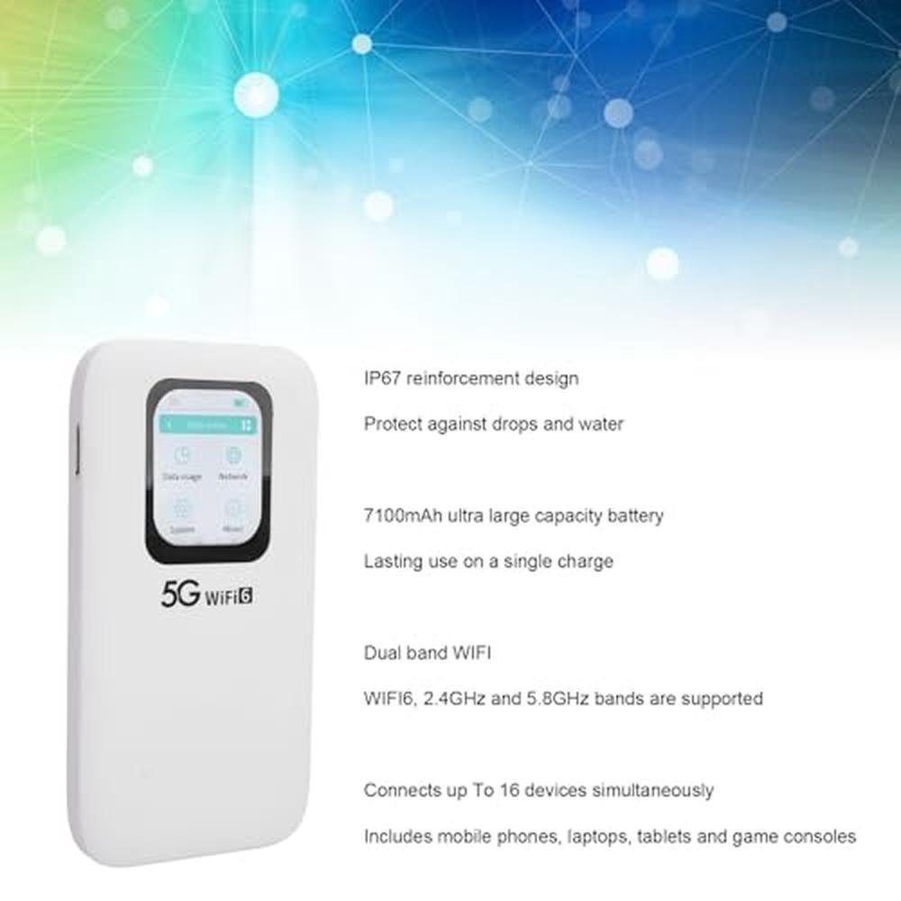 Experience unparalleled connectivity with our premium 5G Wi-Fi 6 mobile hotspot, designed to keep you connected on-the-go. This compact device supports up to 16 devices at once, making it perfect for travelers, business professionals, and families alike. Equipped with a 7100mAh battery and nano SIM card slot, you can enjoy uninterrupted mobile internet anywhere, anytime.