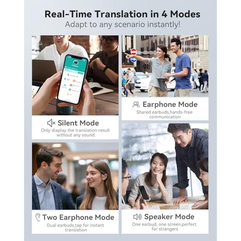 - 6 MODES FOR ANY SITUATIONThe language translator earbuds equipped with multiple translation modes likeSimultaneous Modefor real-time conversations,Speaker Modefor group discussions,Touch Modefor one-tap translations,Photo Translationfor text or signs,Offline Modefor translations without internet andAudio & Video Callsupport for virtual meetings.Perfect for business, travel, and everyday communication