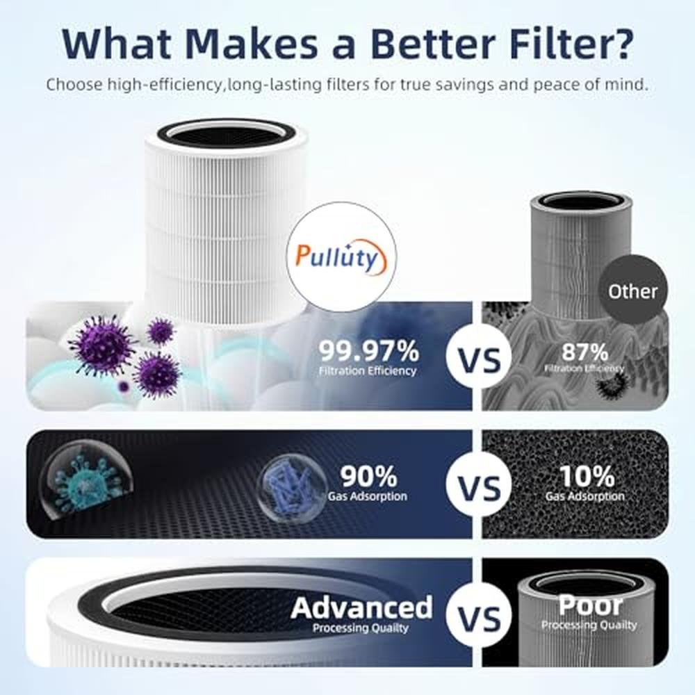 - The Pulluty Core 400S Replacement Filter features a 3-in-1 true H13 HEPA activated carbon pre-filter, capturing 99.97% of particles as small as 0.3 microns
