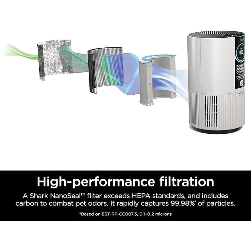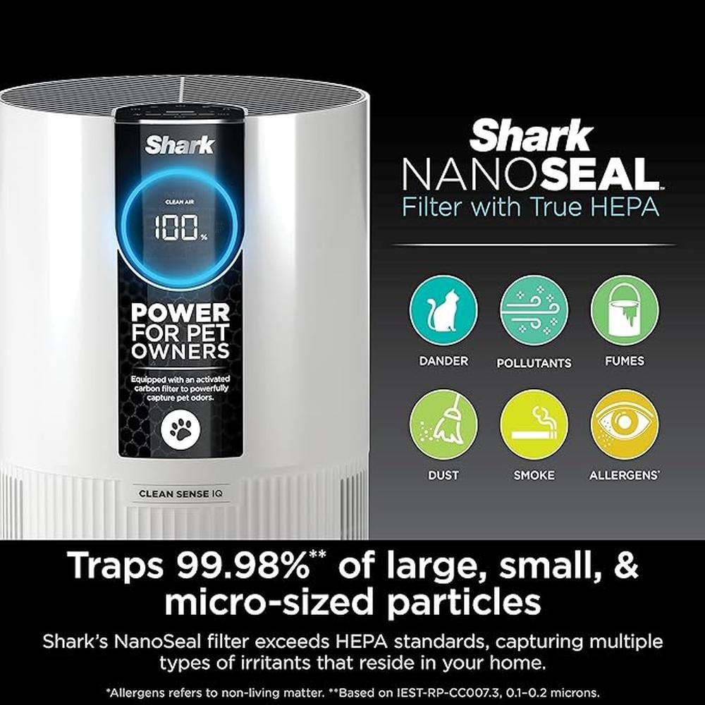 The Shark Air Purifier Pet uses Pure Air MicroForce to deliver fast, powerful, and quiet purification in a compact size. Clean Sense IQ senses air quality and auto-adjusts power to constantly maintain clean air in your home, while reporting results in real time. Our Anti-Allergen HEPA filter is designed to tackle a wide array of air contaminants with precision. From smog, toxins, and VOCs to wildfire smoke and more, experience comprehensive purification for healthier indoor air quality. The True HEPA filter captures 99.98 of airborne particles like allergens, dust, and dander. Purchase replacement filters every 6-12 months, based on continuous use. Genuine HE1FKPET Shark Filters ensure your air purifier will function and filter properlyoff-brand filters can lead to lower reliability and cause damage. Ultra quiet performance, with dimmable lights for minimal sleep interruption for a good nights sleep. Cleans up to 500 square feet.
